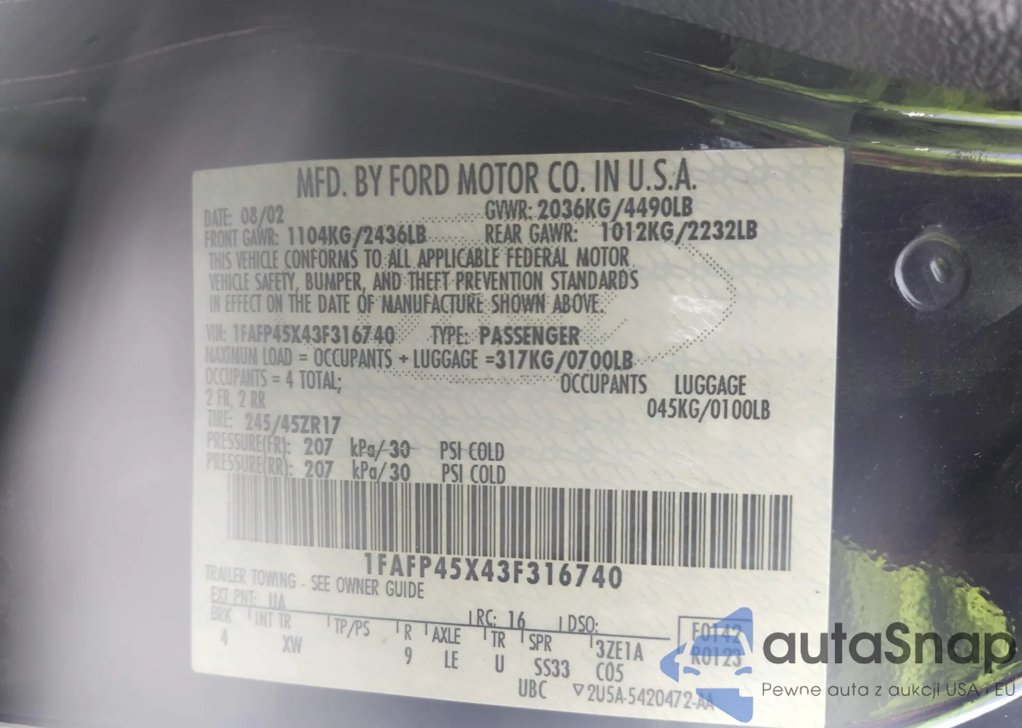 LOT: 42760197 VIN: 1FAFP45X43F316740
