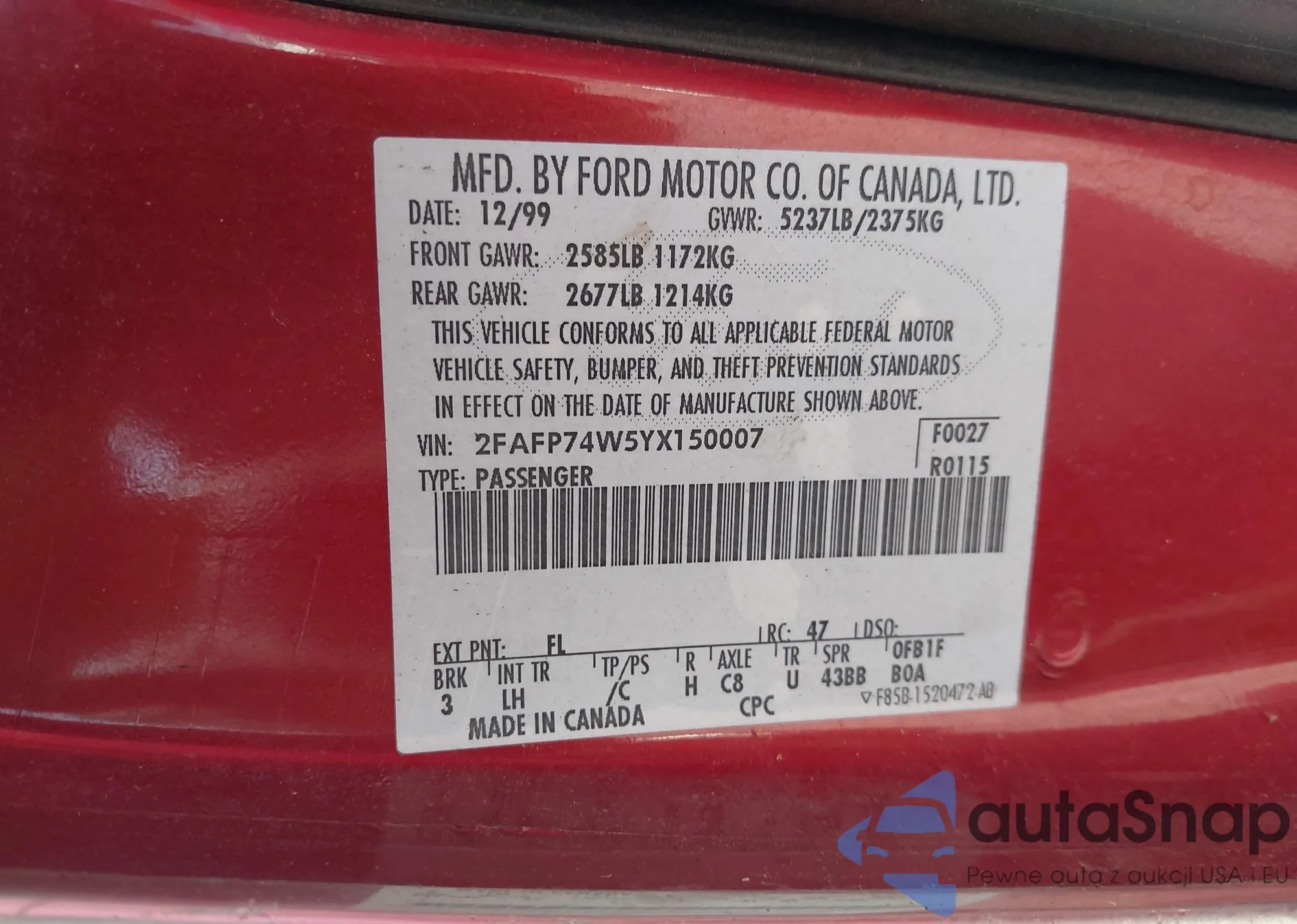 LOT: 42877510 VIN: 2FAFP74W5YX150007
