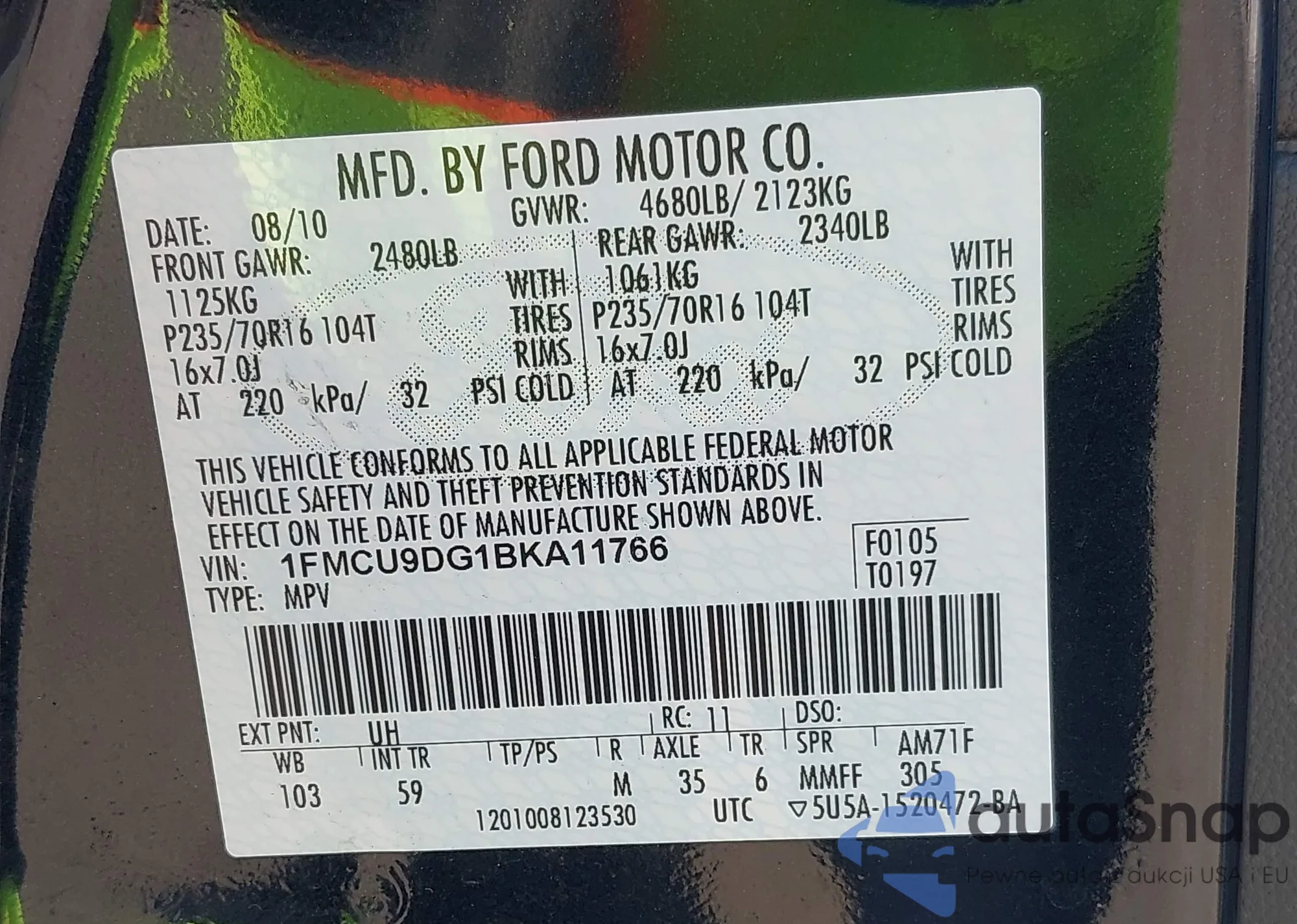 • VIN 1FMCU9DG1BKA11766