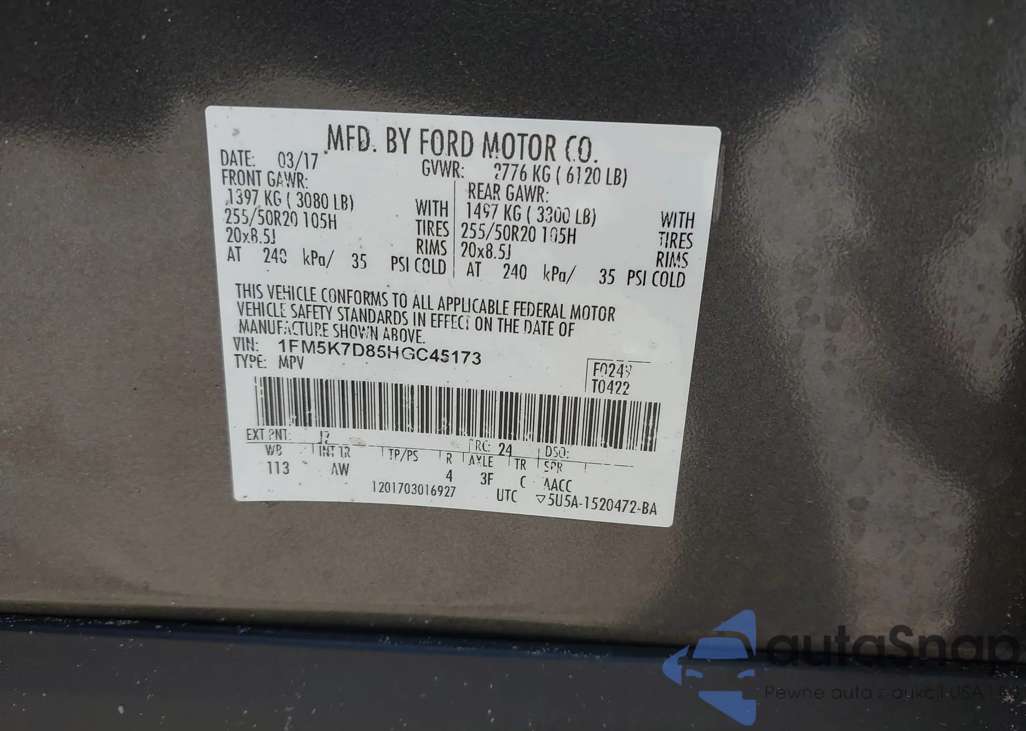 LOT: 42696064 VIN: 1FM5K7D85HGC45173