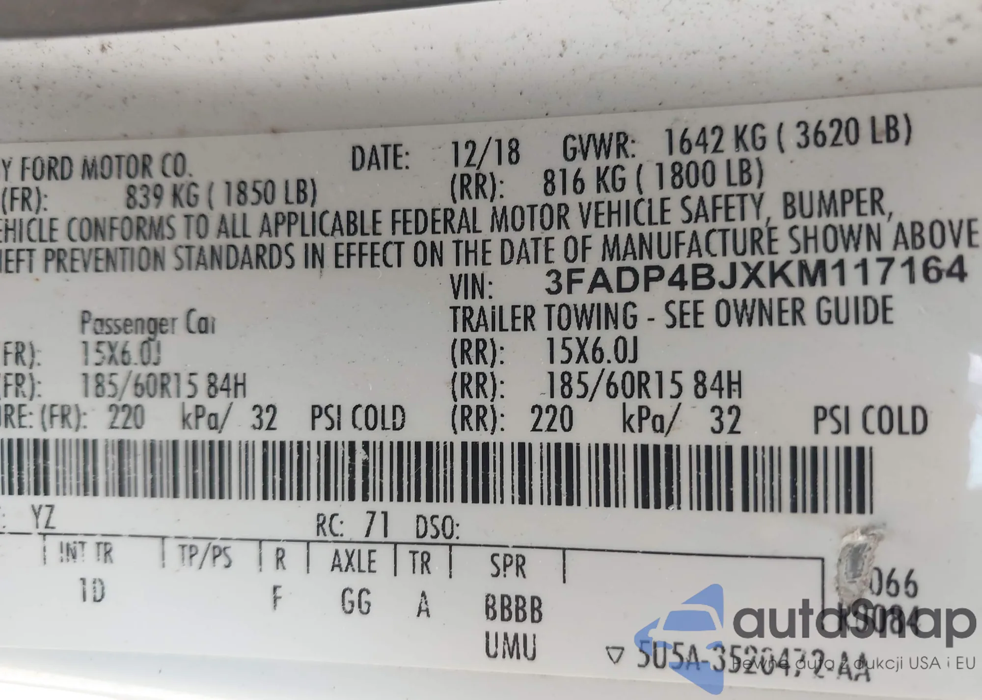 LOT: 42716411 VIN: 3FADP4BJXKM117164