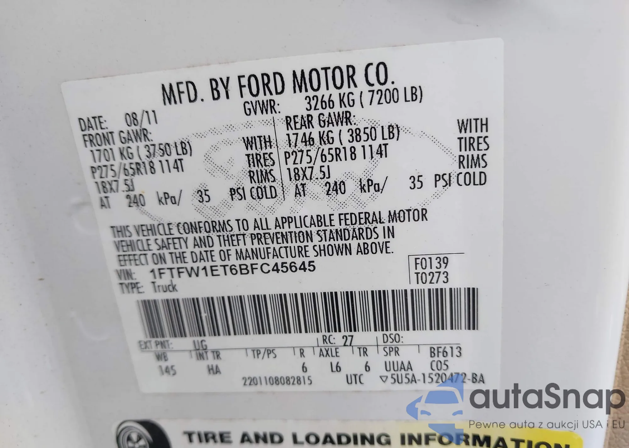LOT: 42815576 VIN: 1FTFW1ET6BFC45645
