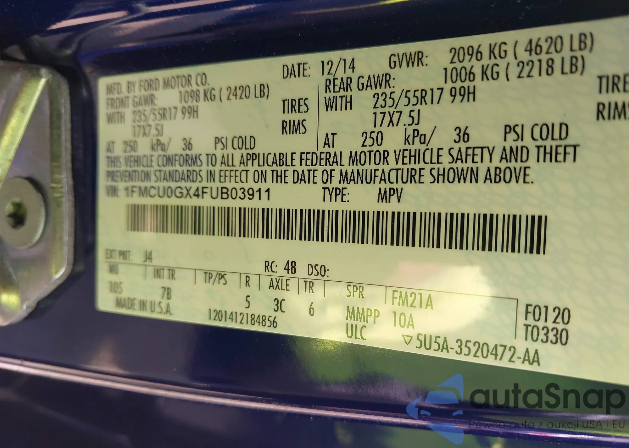 • VIN 1FMCU0GX4FUB03911