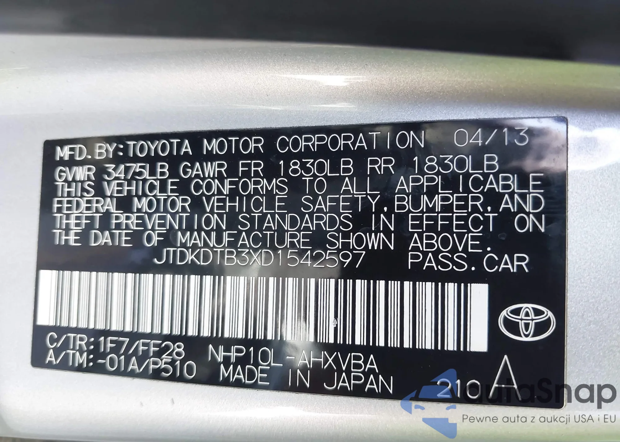 • VIN JTDKDTB3XD1542597