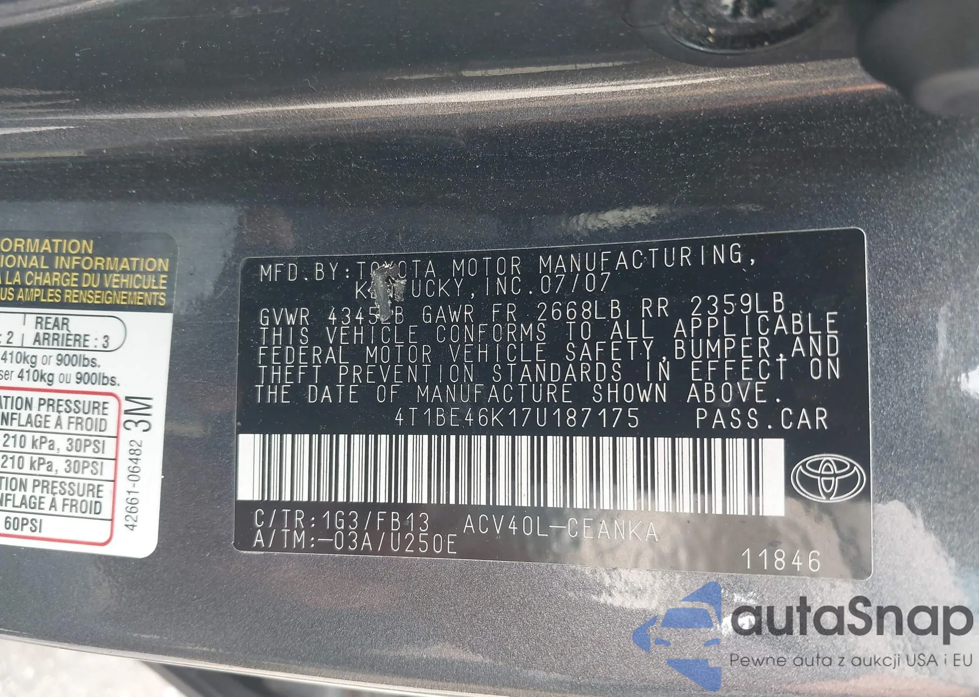 LOT: 42925471 VIN: 4T1BE46K17U187175