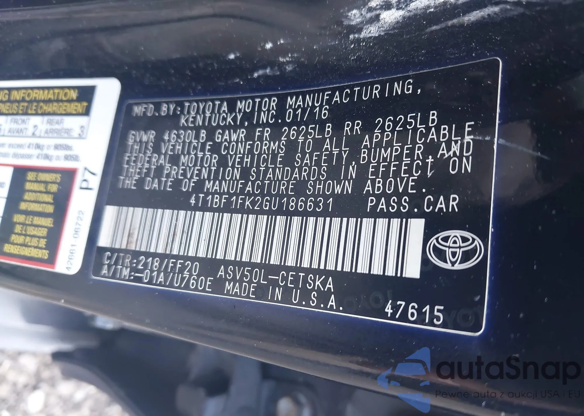 • VIN 4T1BF1FK2GU186631