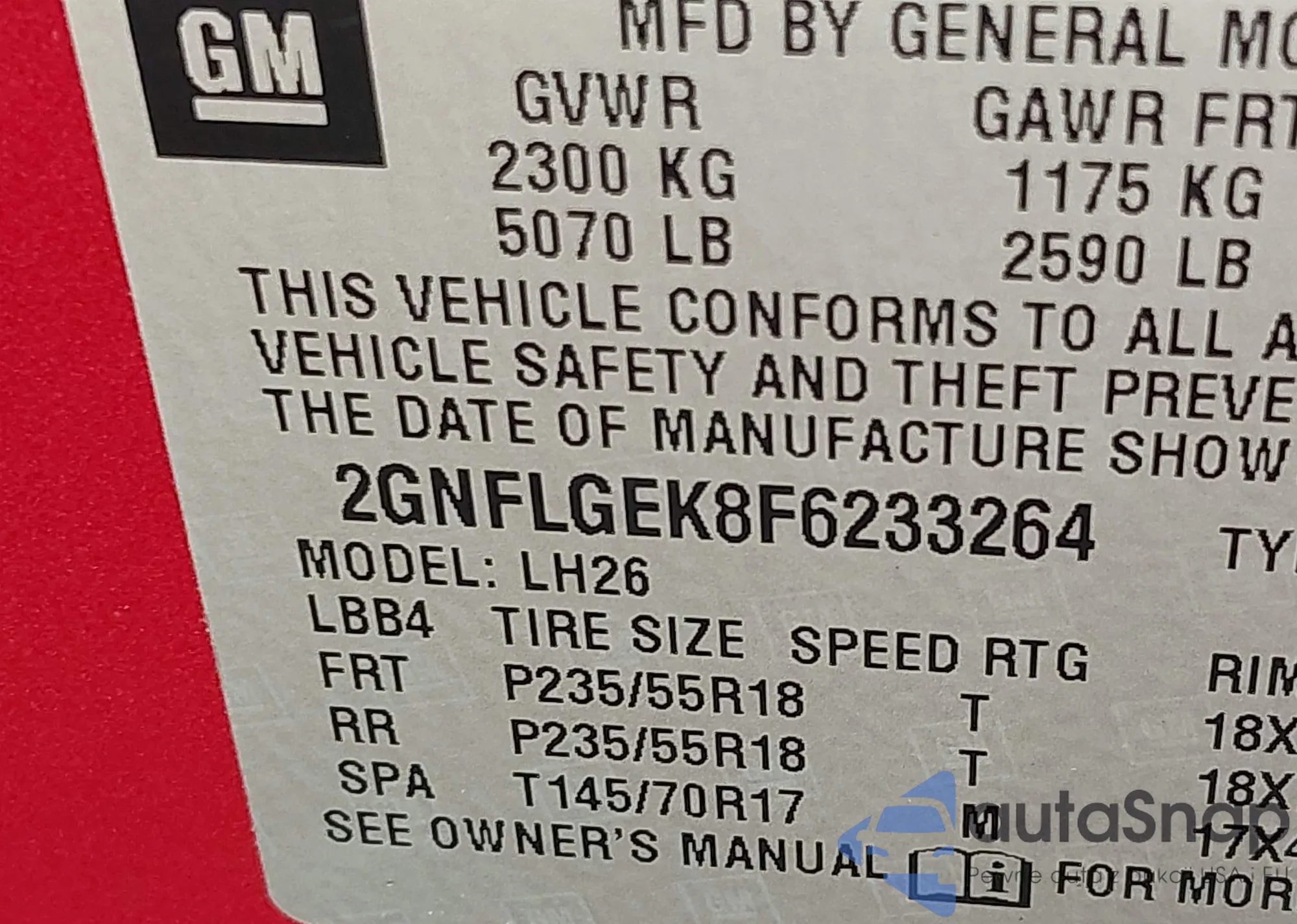 • VIN 2GNFLGEK8F6233264
