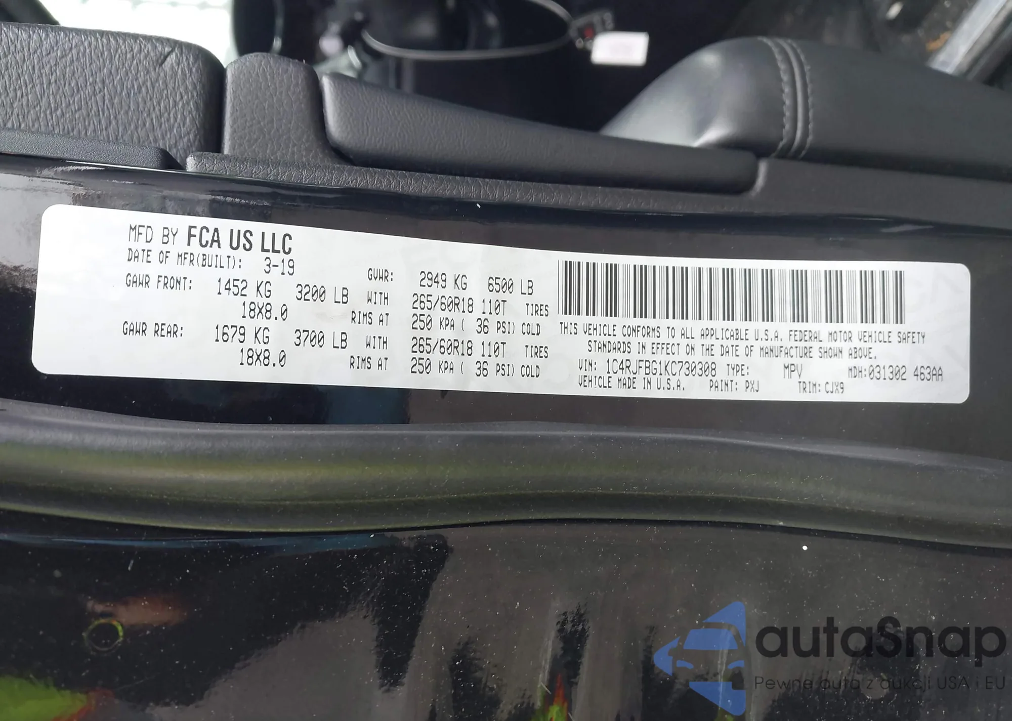 • VIN 1C4RJFBG1KC730308