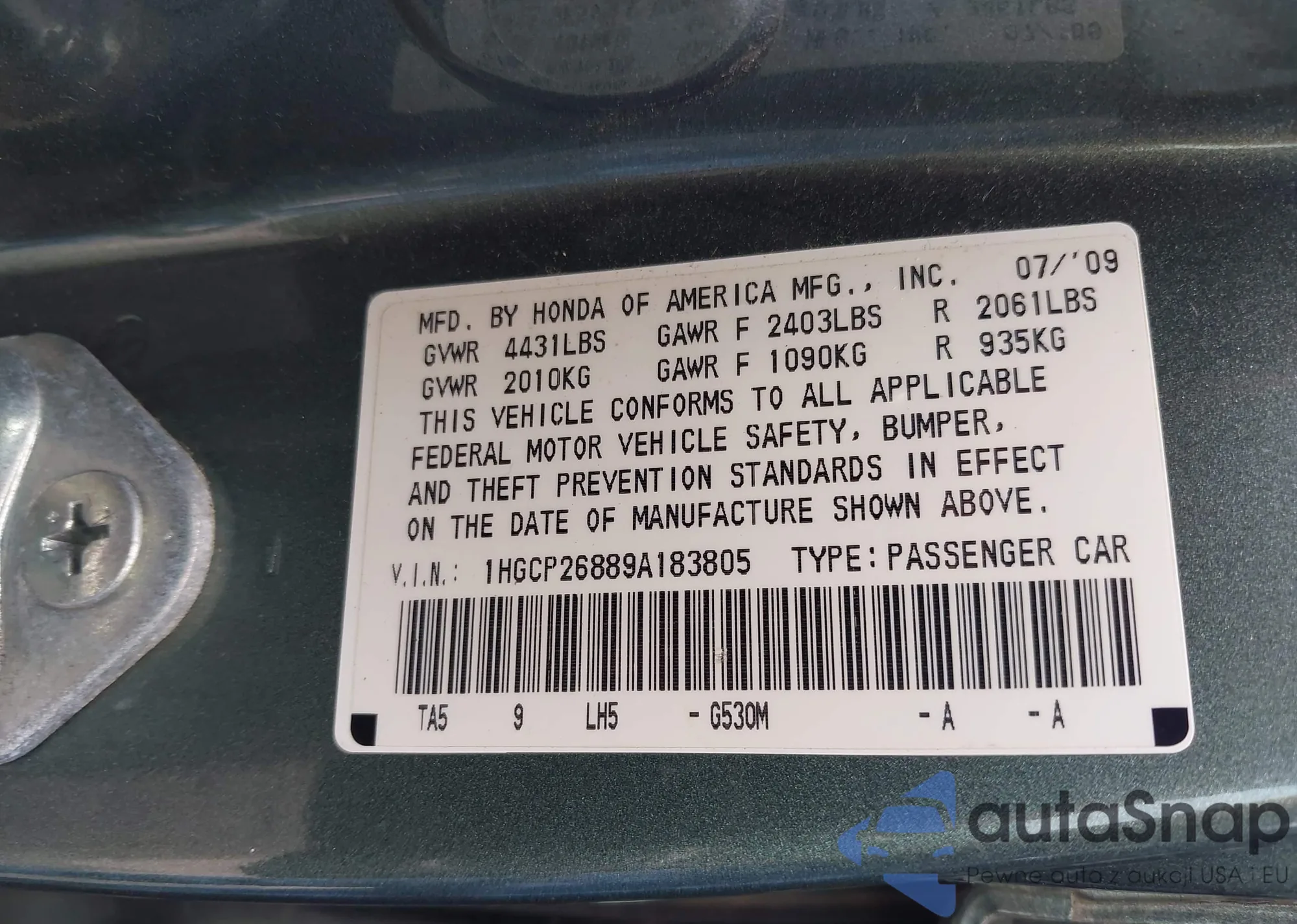 • VIN 1HGCP26889A183805
