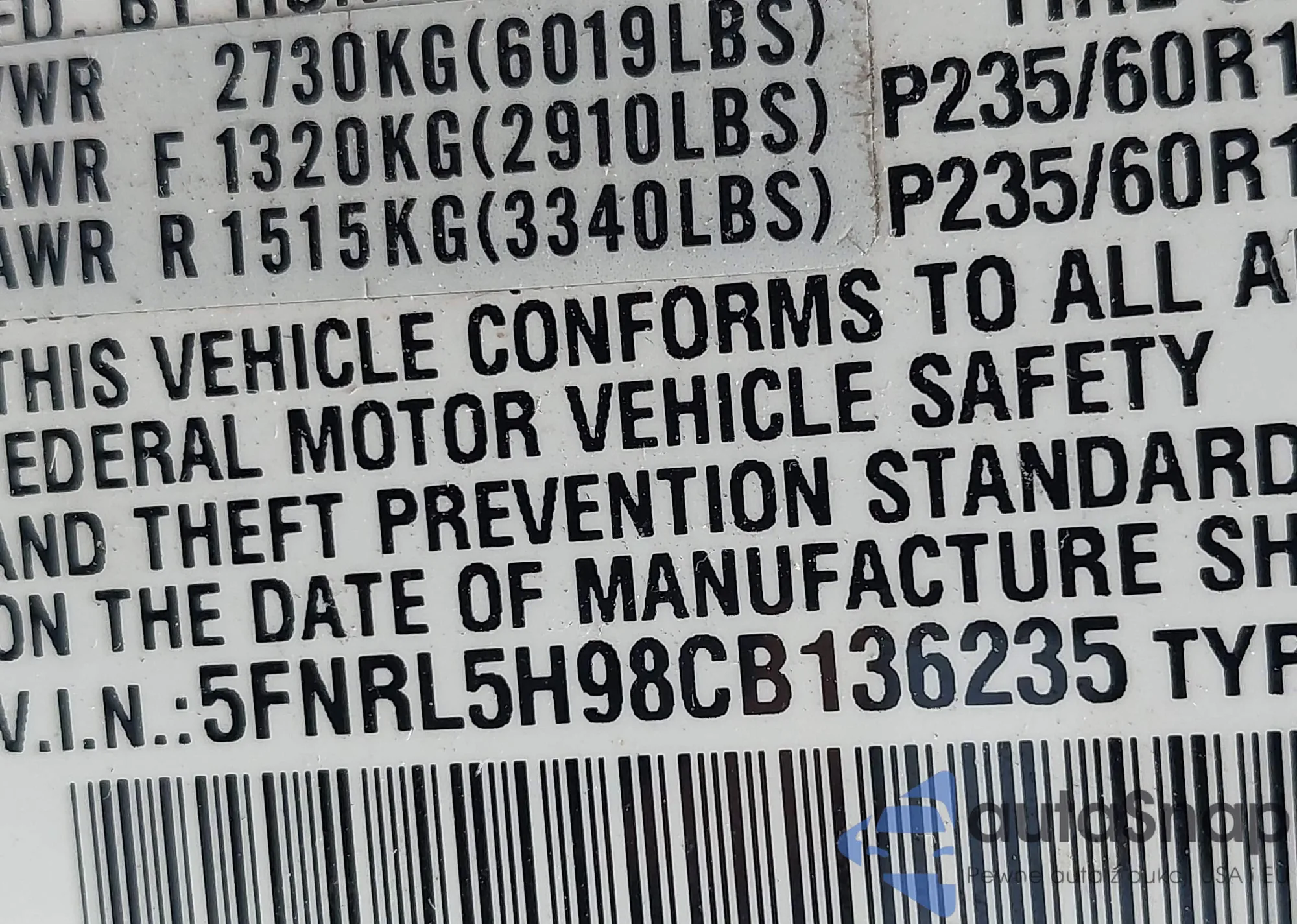 • VIN 5FNRL5H98CB136235