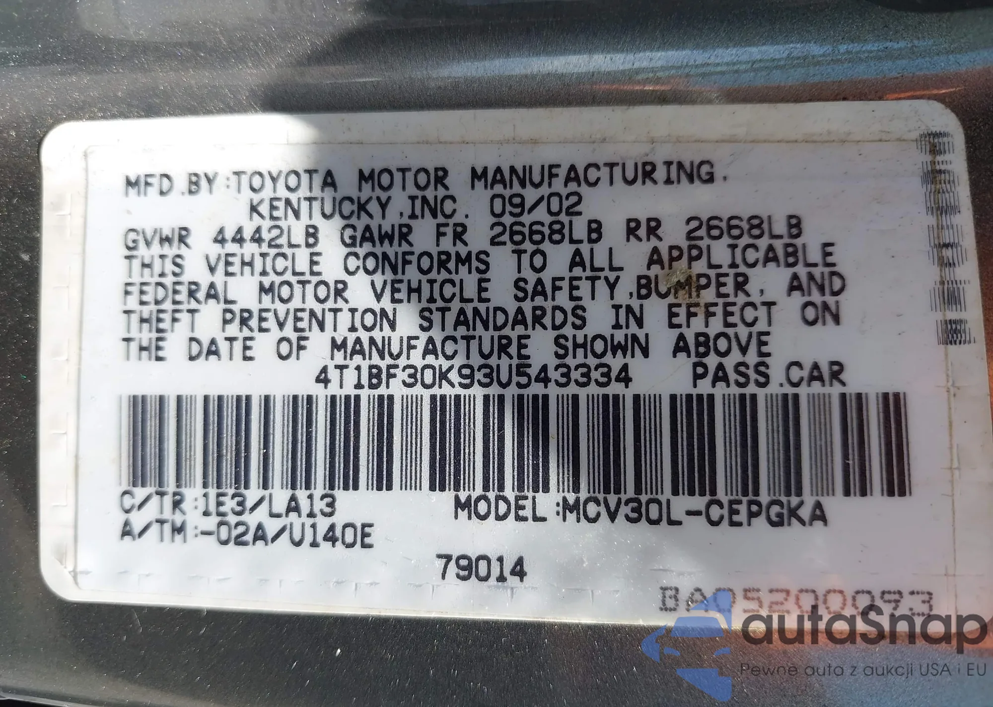 LOT: 42772307 VIN: 4T1BF30K93U543334