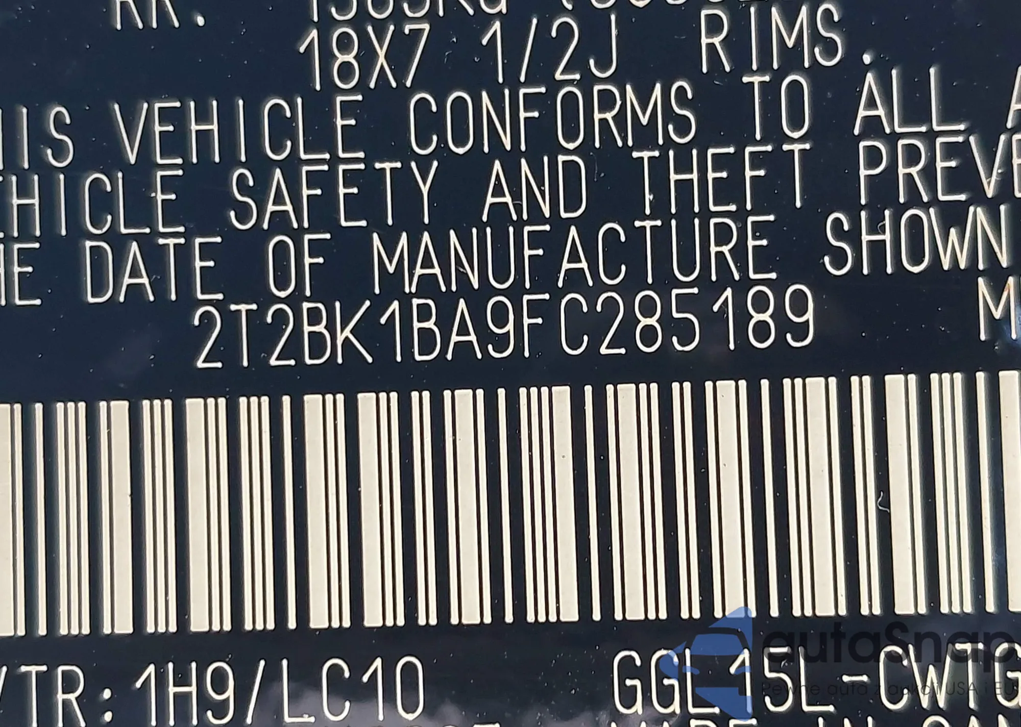 • VIN 2T2BK1BA9FC285189