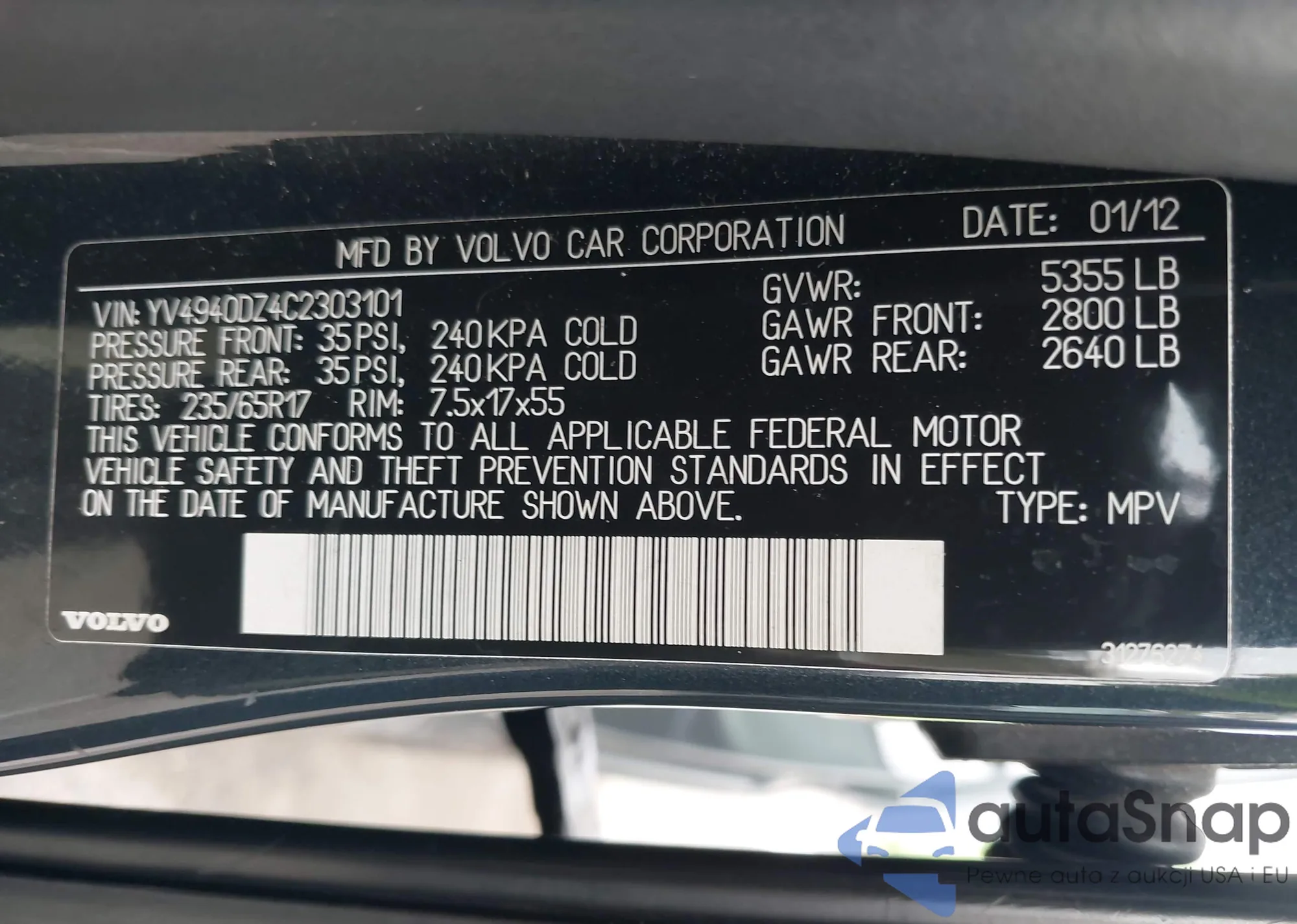 LOT: 42578022 VIN: YV4940DZ4C2303101