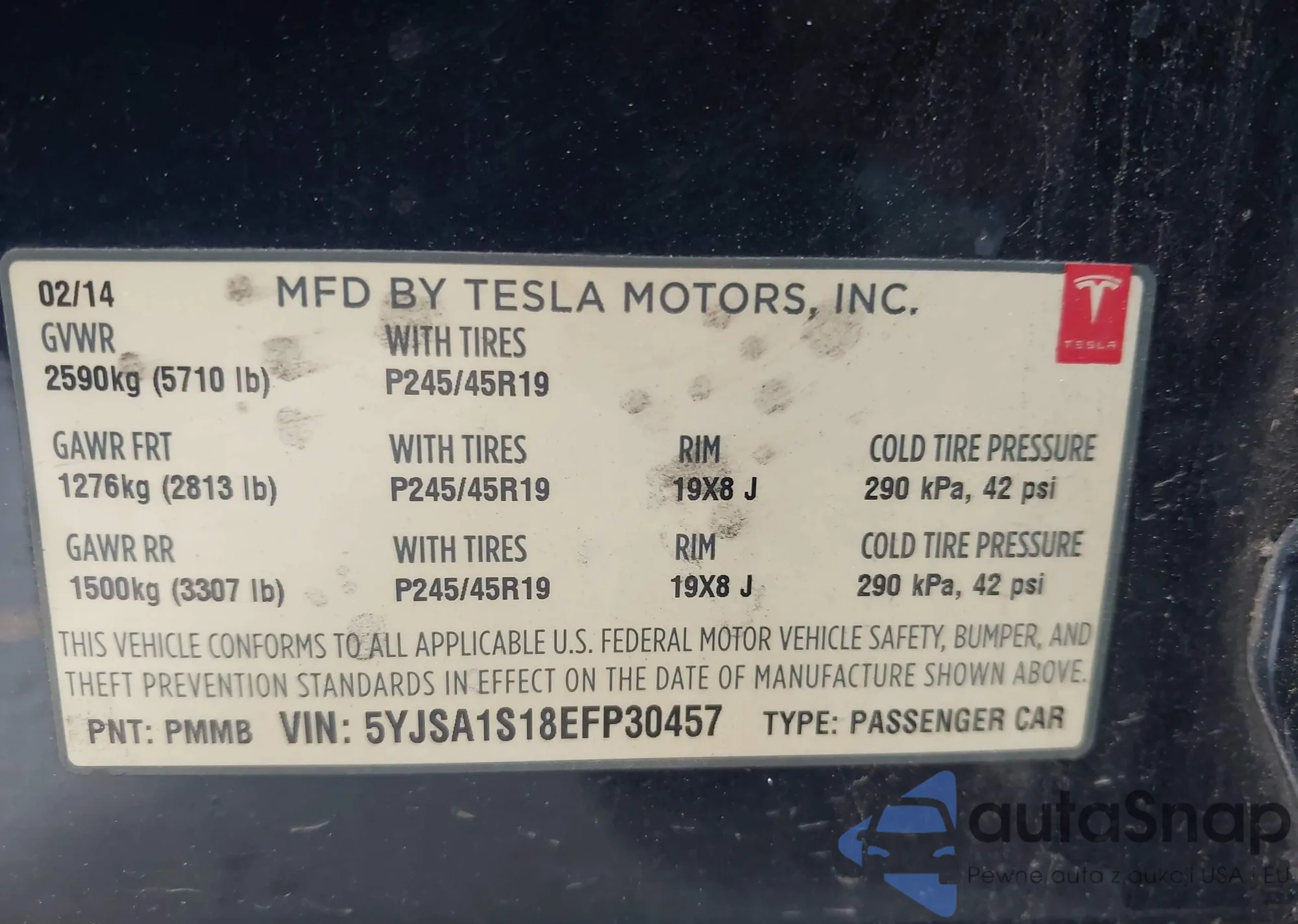 LOT: 42577336 VIN: 5YJSA1S18EFP30457
