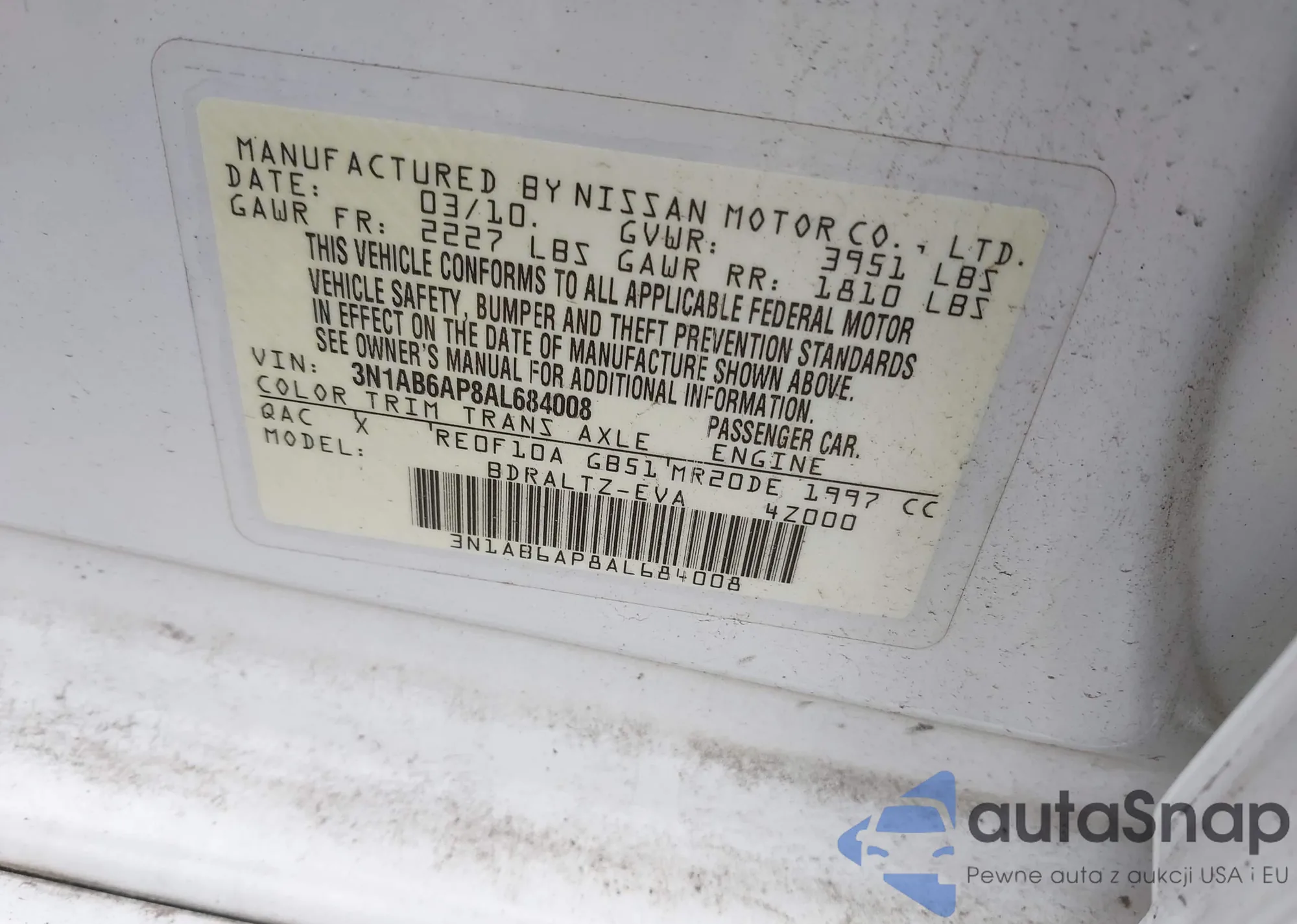 LOT: 42521620 VIN: 3N1AB6AP8AL684008