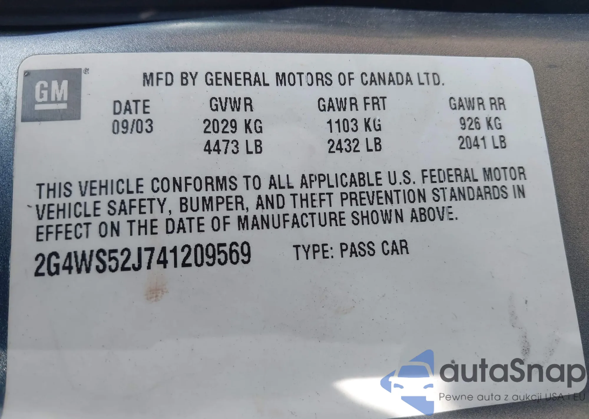 LOT: 42691658 VIN: 2G4WS52J741209569