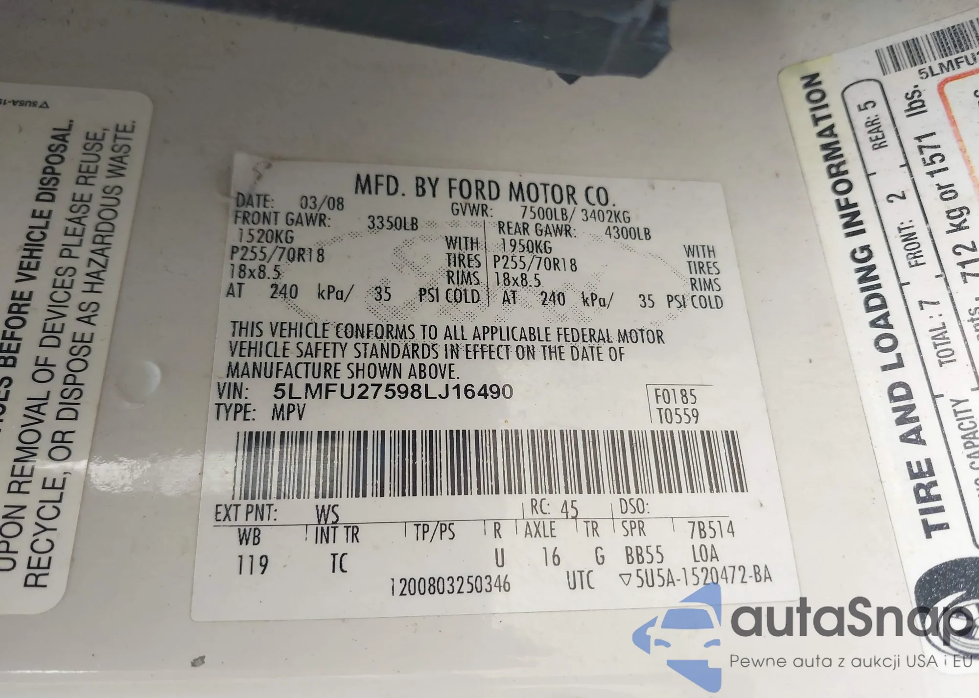 LOT: 42694550 VIN: 5LMFU27598LJ16490
