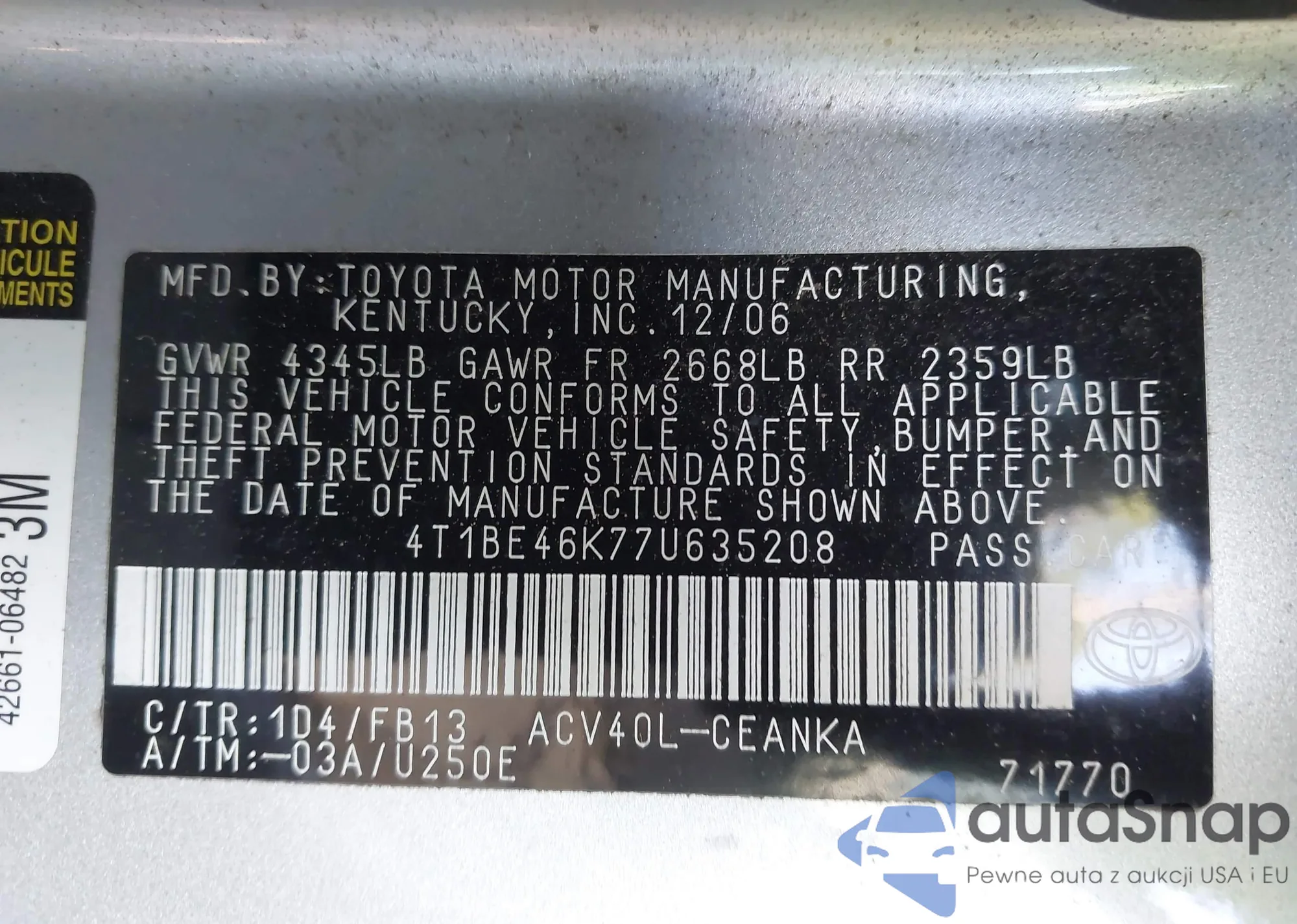 LOT: 43018795 VIN: 4T1BE46K77U635208