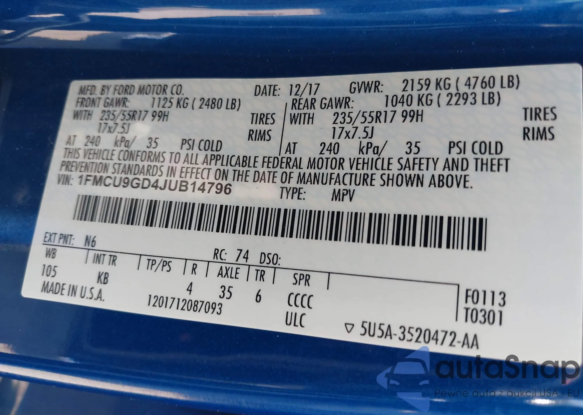 • VIN 1FMCU9GD4JUB14796