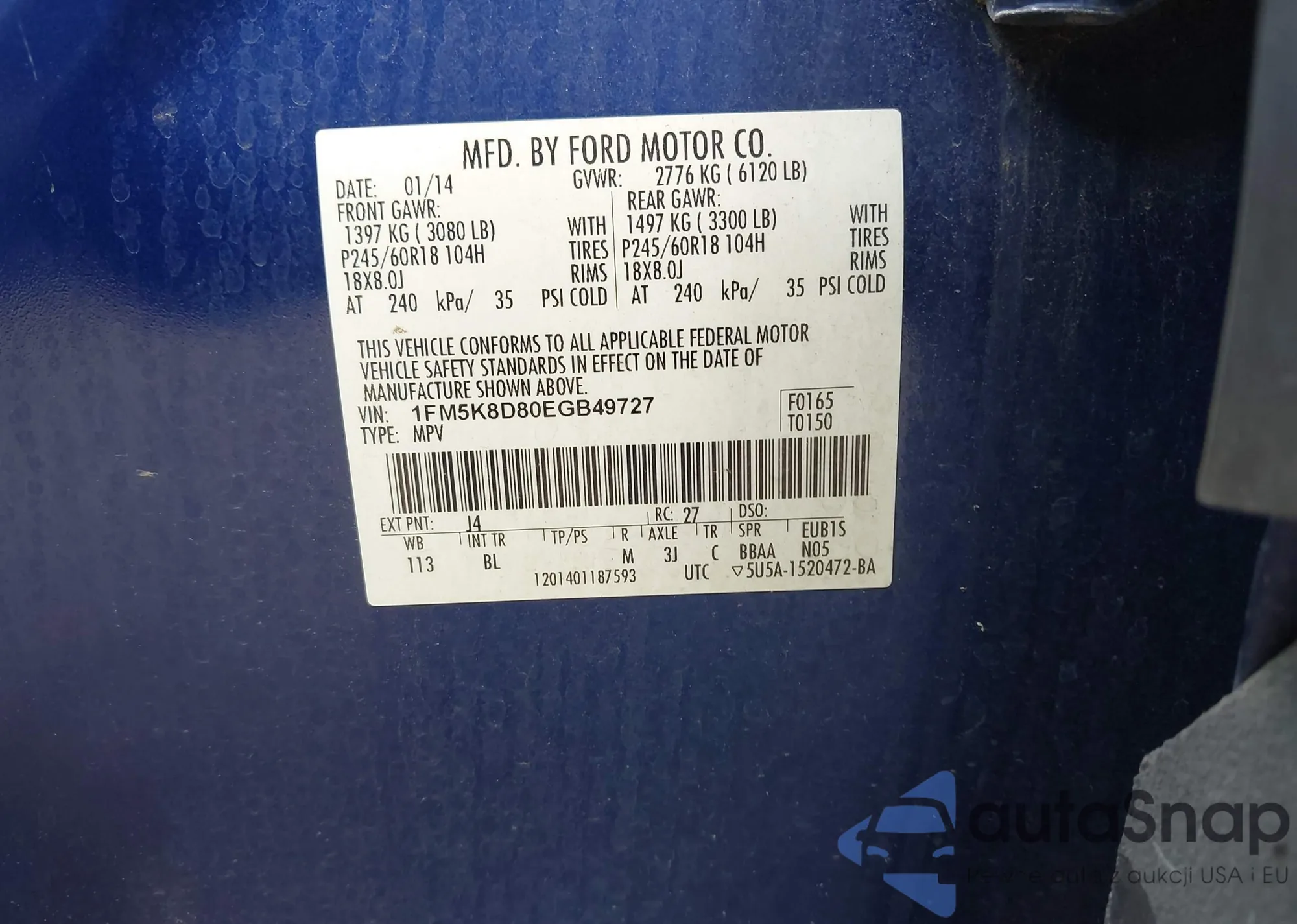 LOT: 42487581 VIN: 1FM5K8D80EGB49727