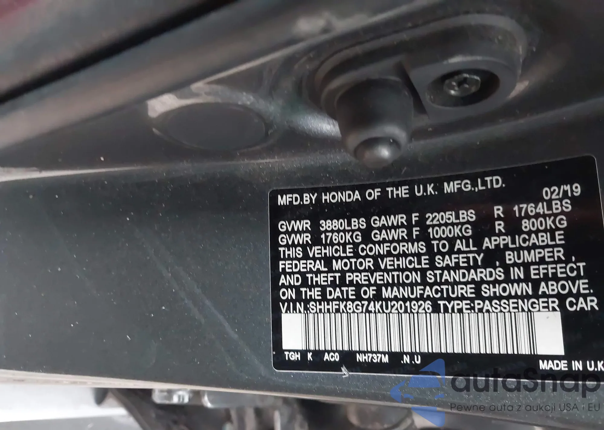 LOT: 42324957 VIN: SHHFK8G74KU201926