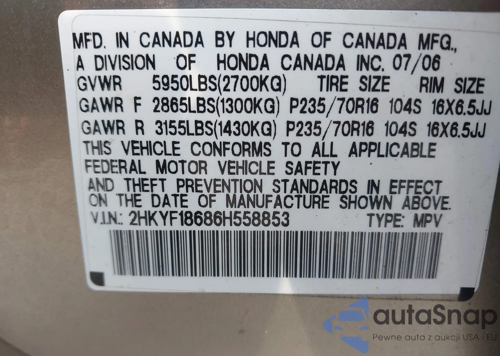 • VIN 2HKYF18686H558853