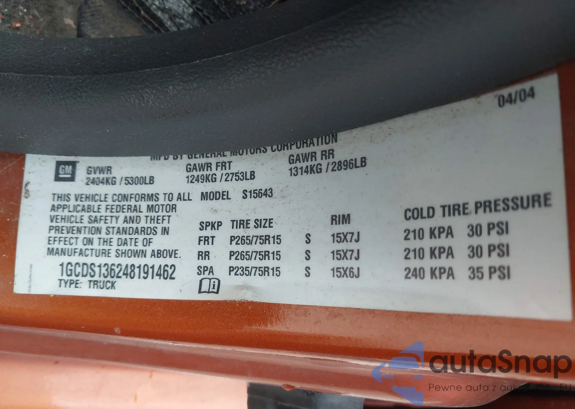 • VIN 1GCDS136248191462
