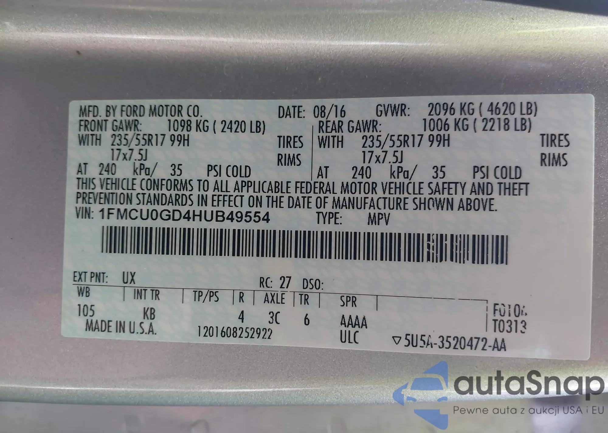 LOT: 40494413 VIN: 1FMCU0GD4HUB49554