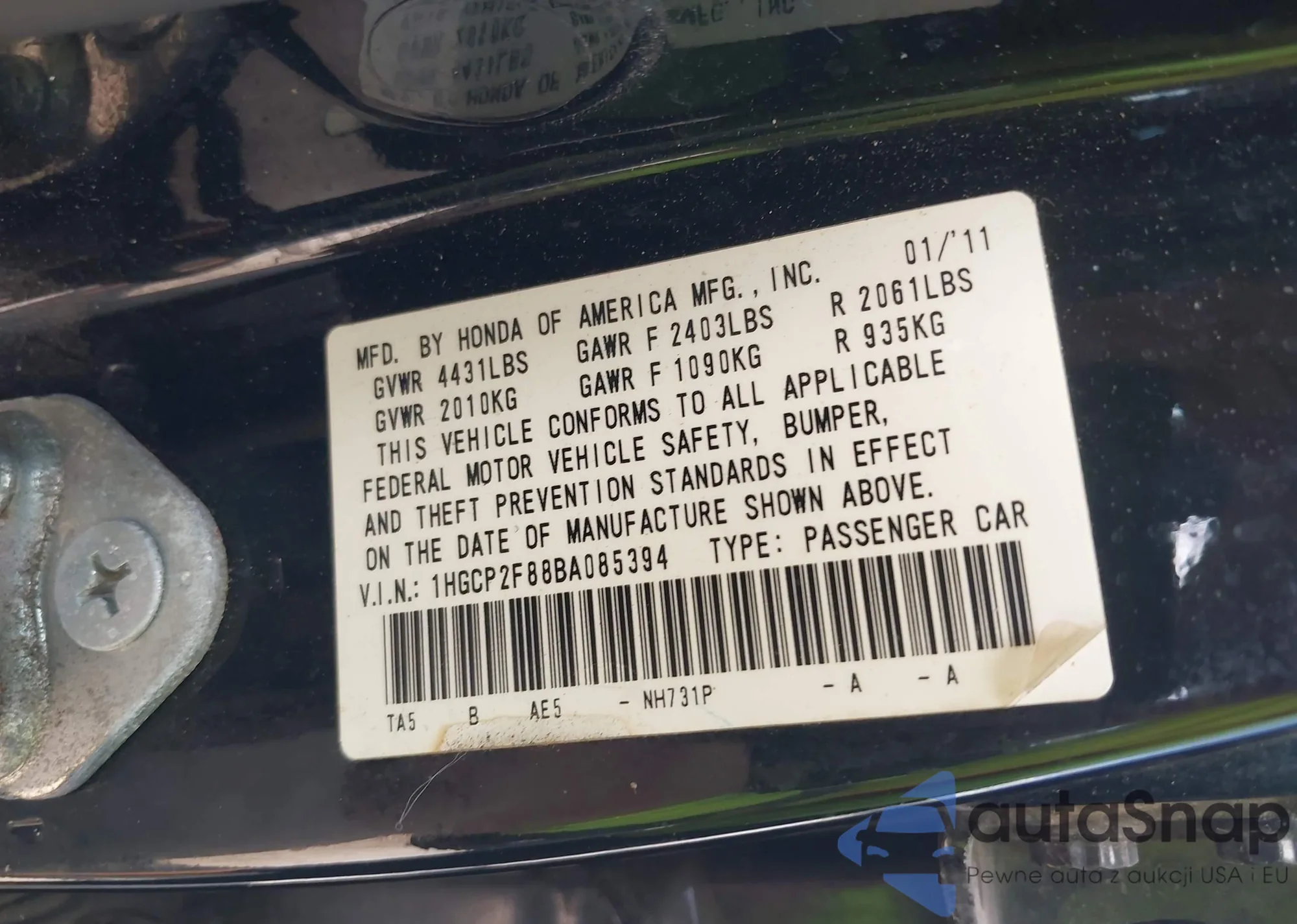 LOT: 42655524 VIN: 1HGCP2F88BA085394