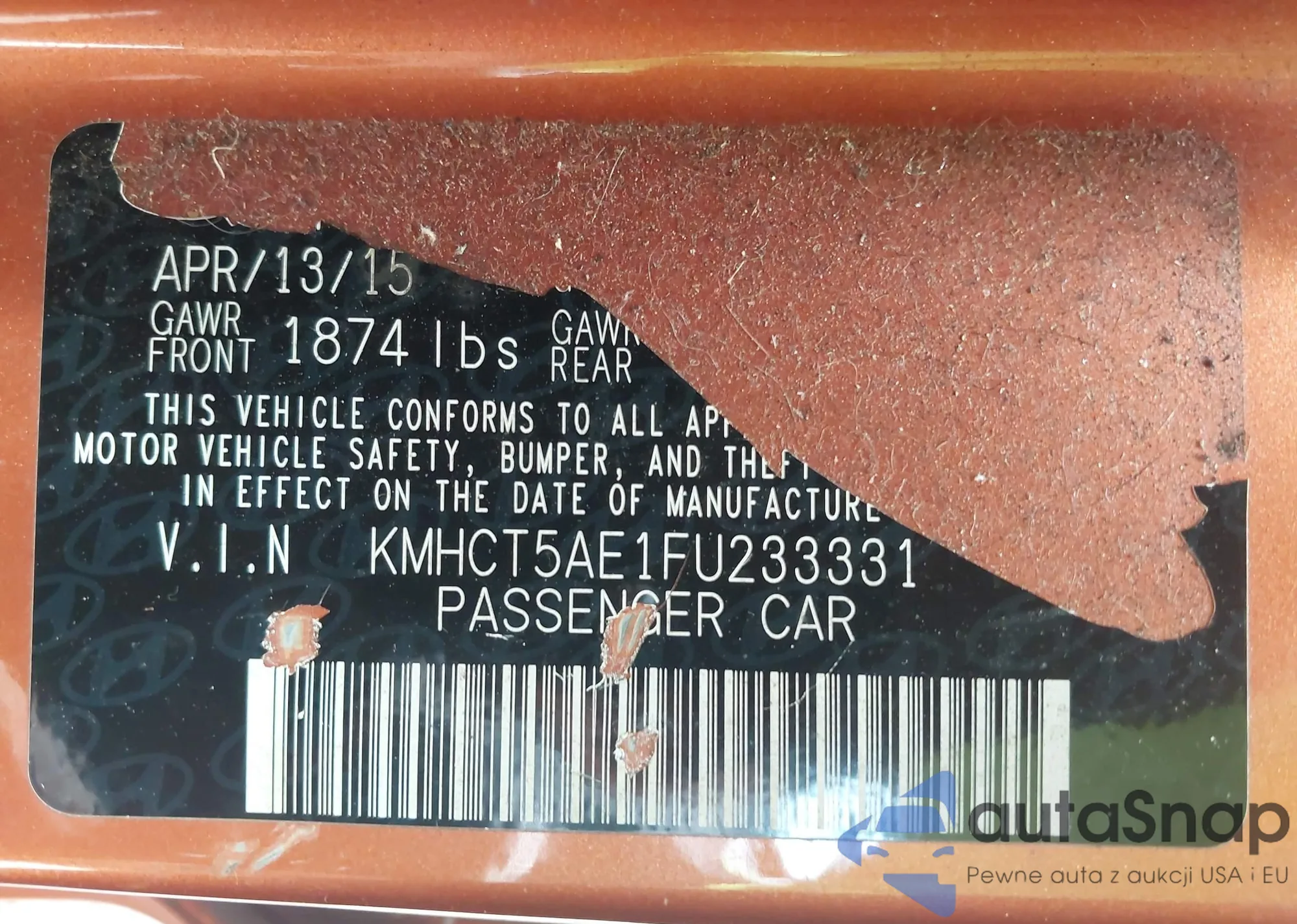 LOT: 42787499 VIN: KMHCT5AE1FU233331
