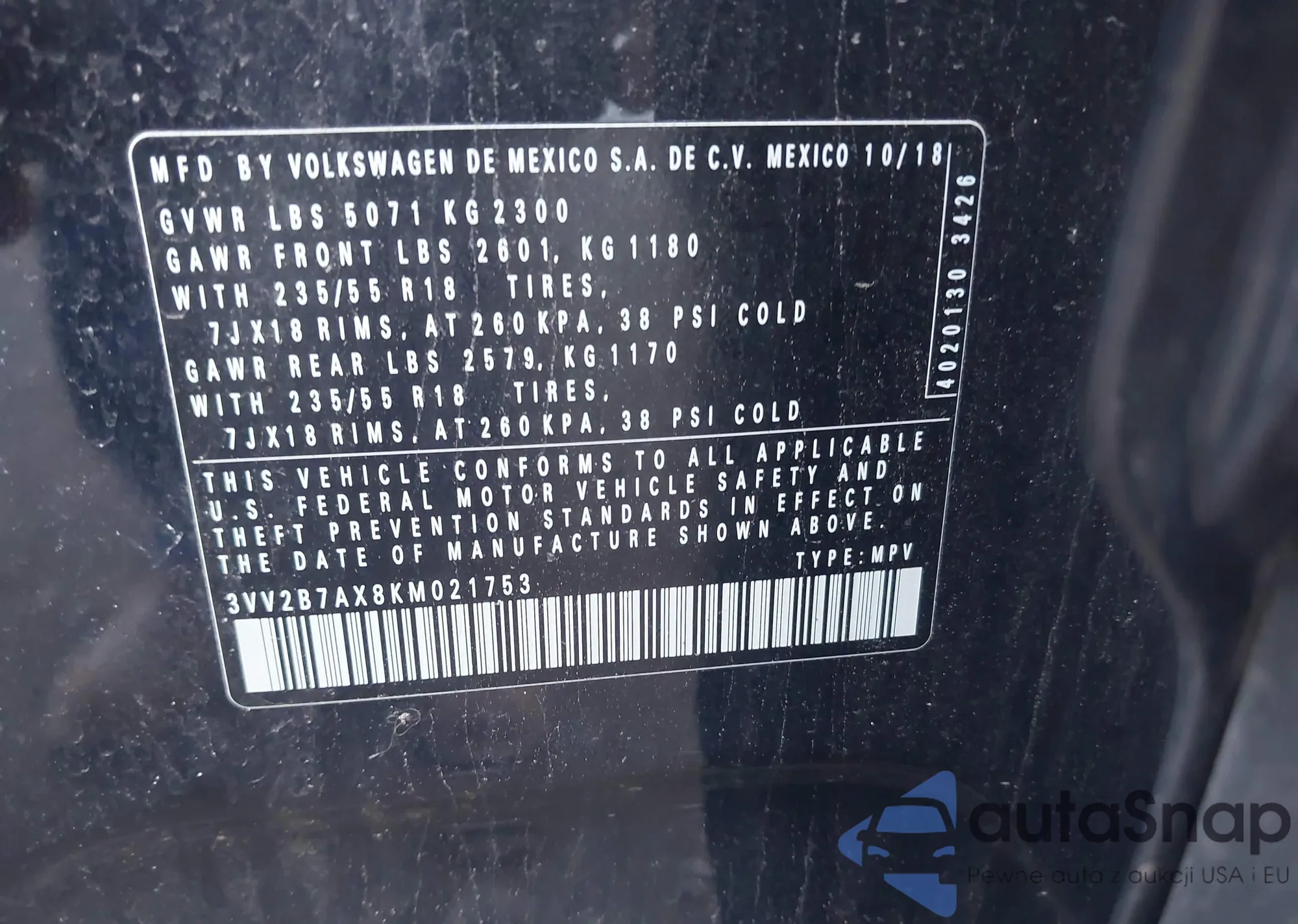 LOT: 42854431 VIN: 3VV2B7AX8KM021753