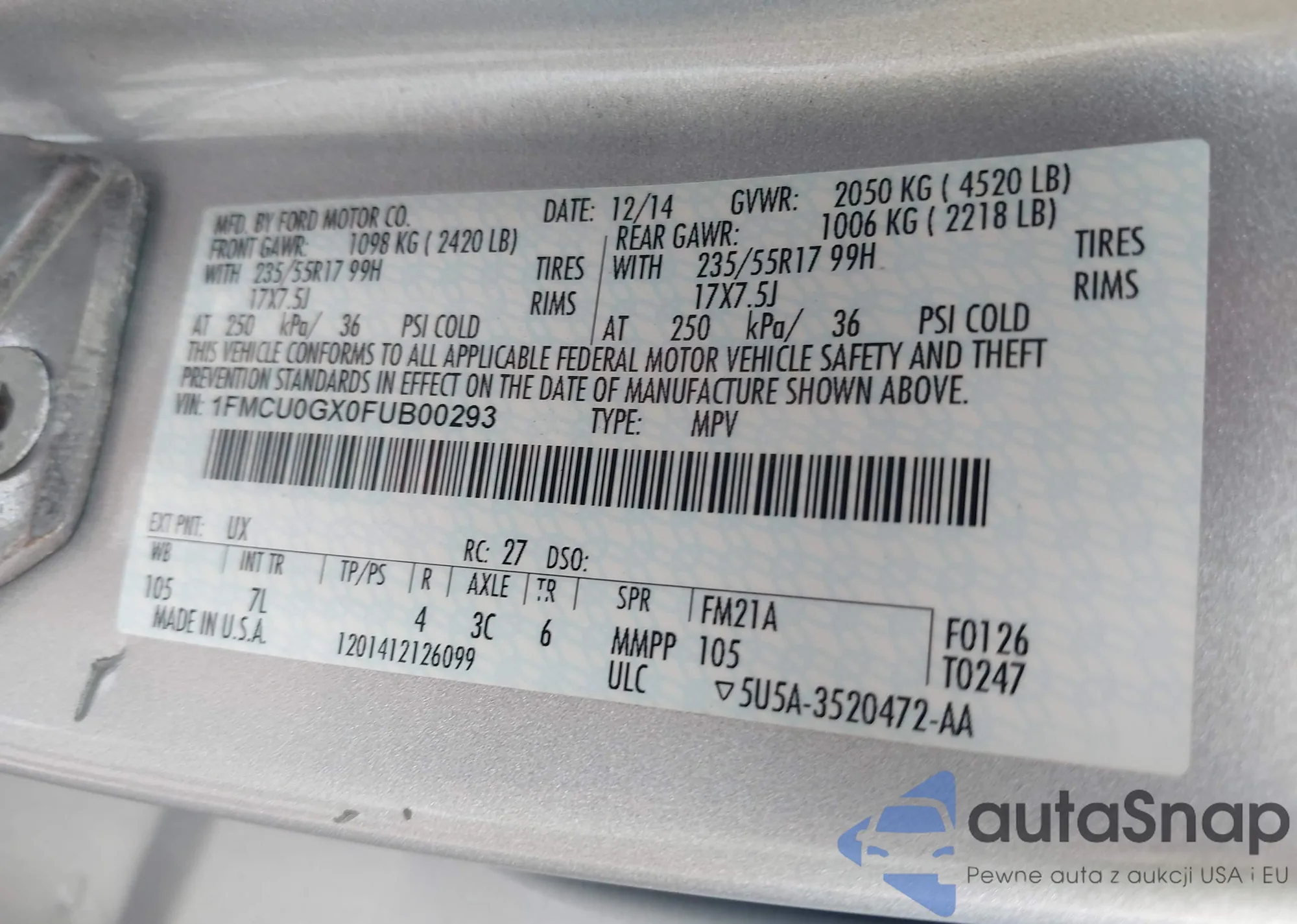 • VIN 1FMCU0GX0FUB00293