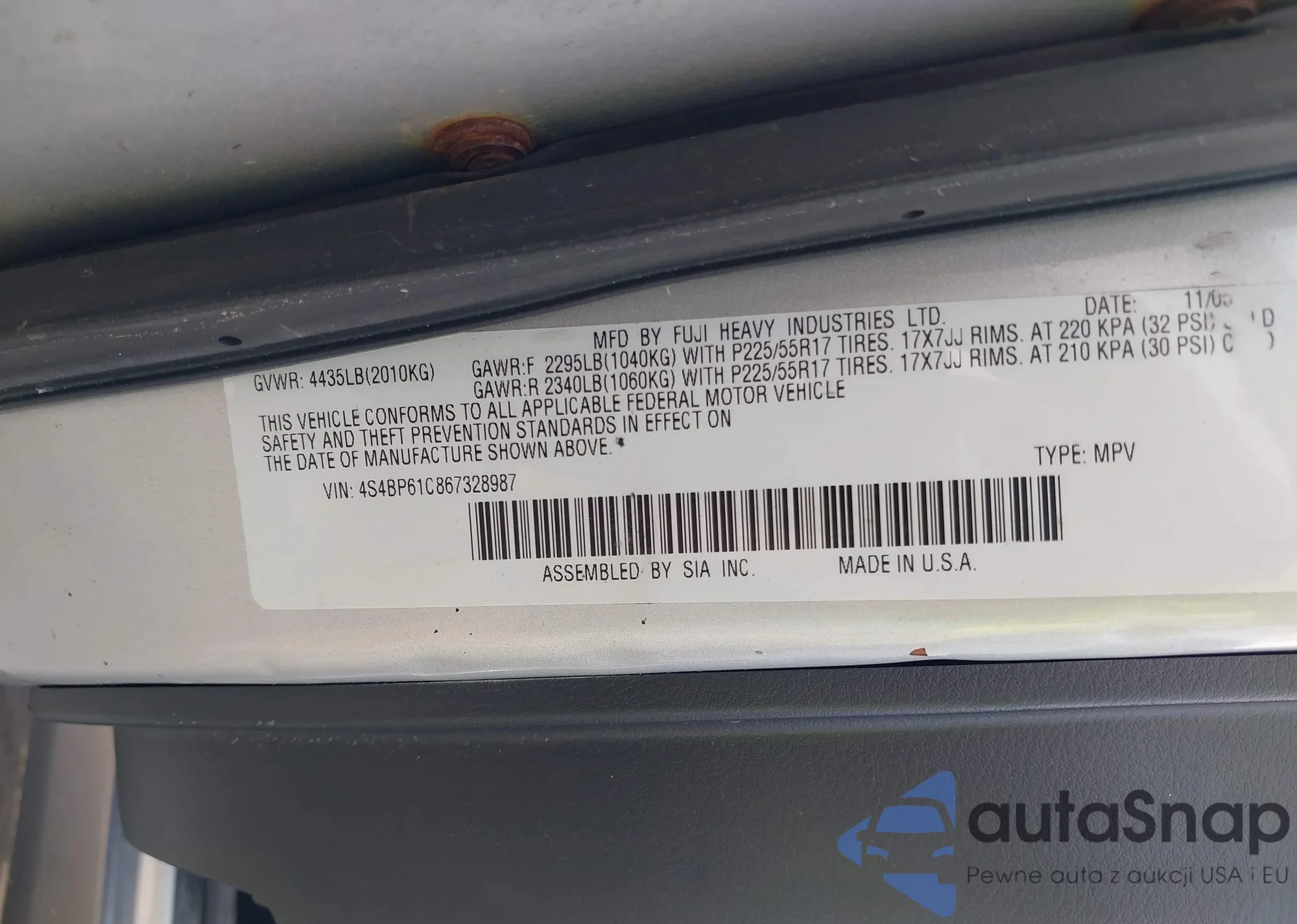 • VIN 4S4BP61C867328987