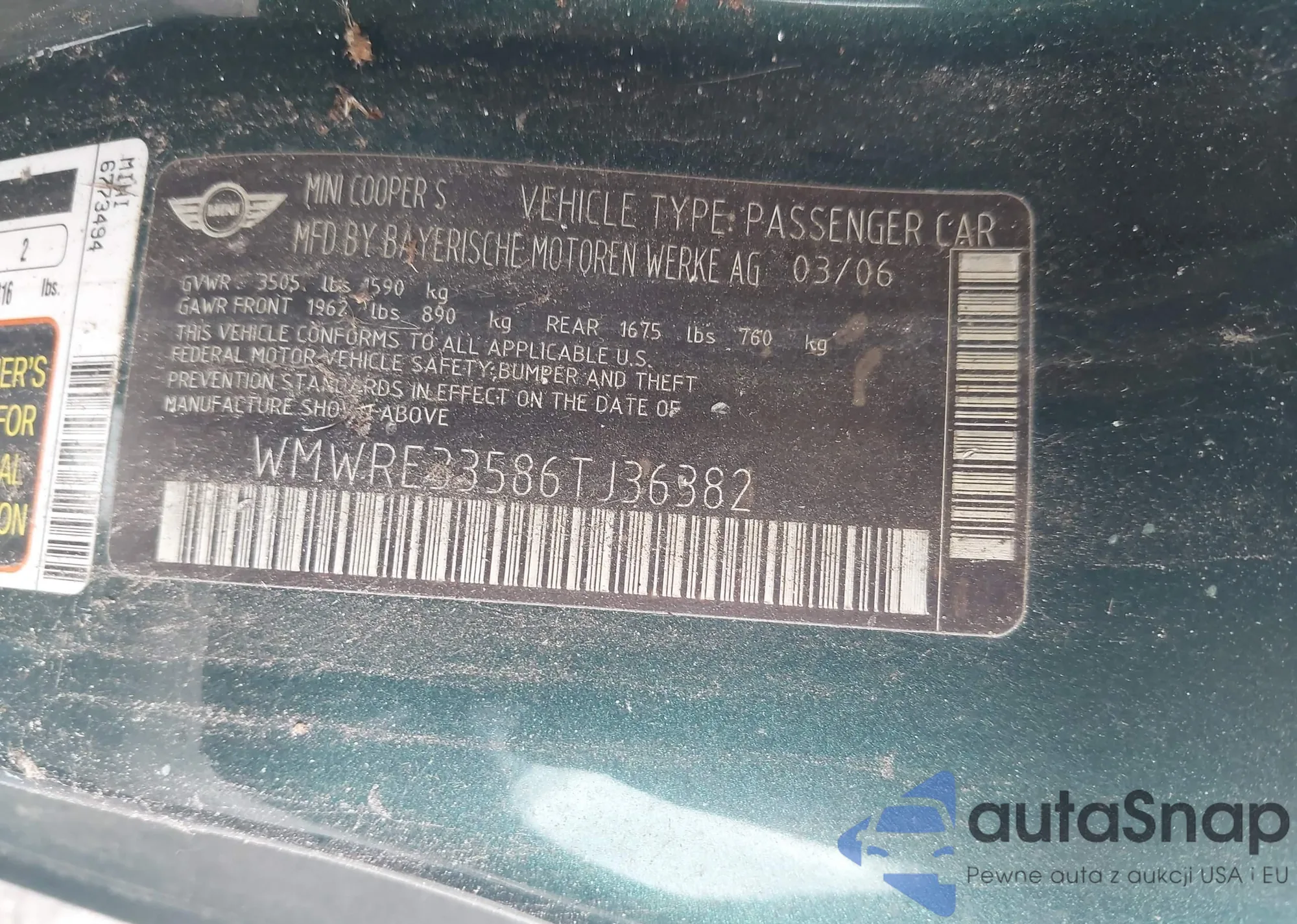 2006 Mini Cooper S из США, поврежденный, VIN WMWRE33586TJ36382