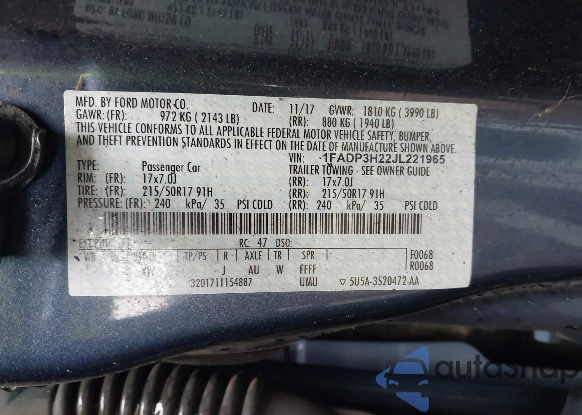 LOT: 42875069 VIN: 1FADP3H22JL221965