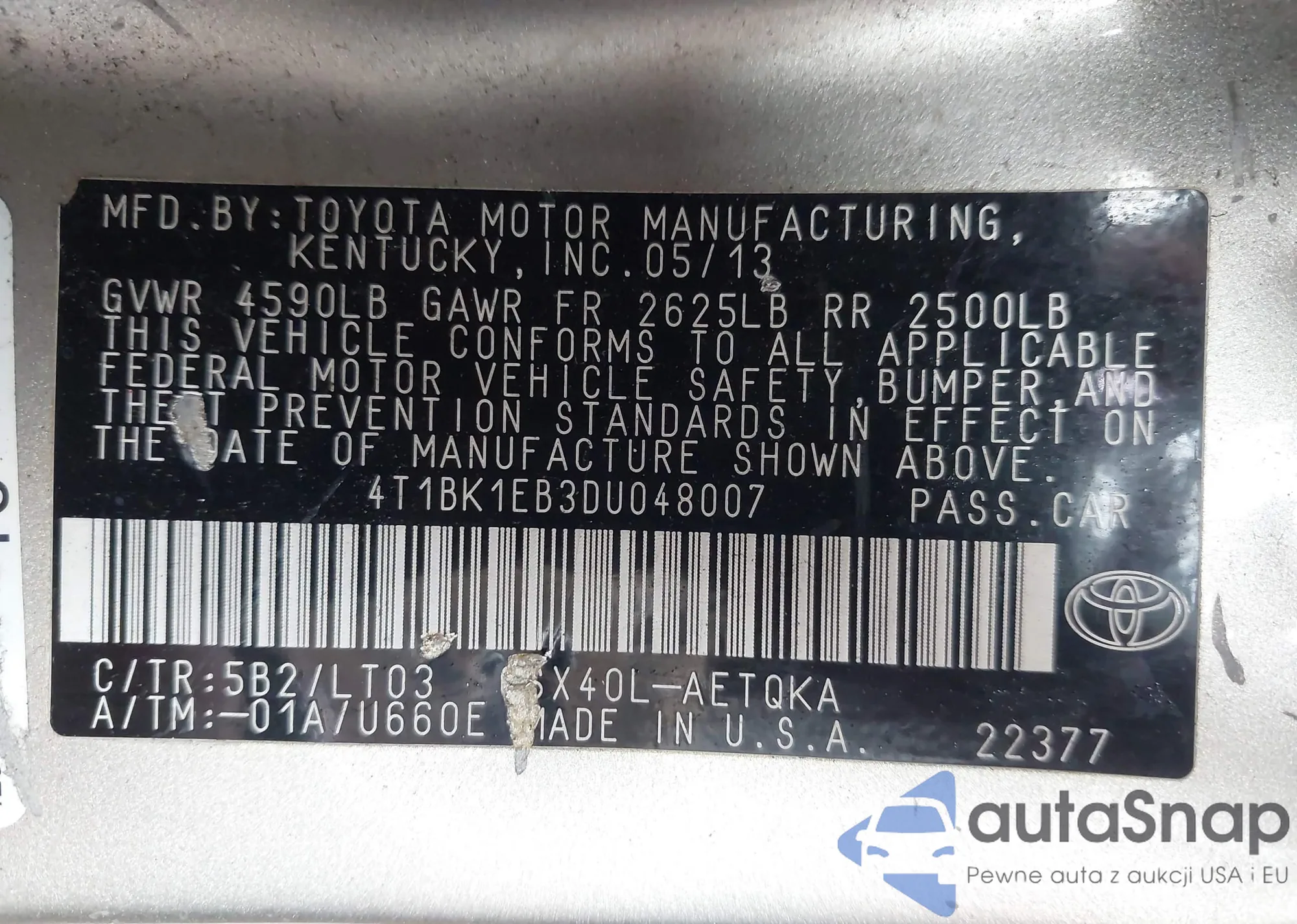 LOT: 42809526 VIN: 4T1BF1FK1DU665506