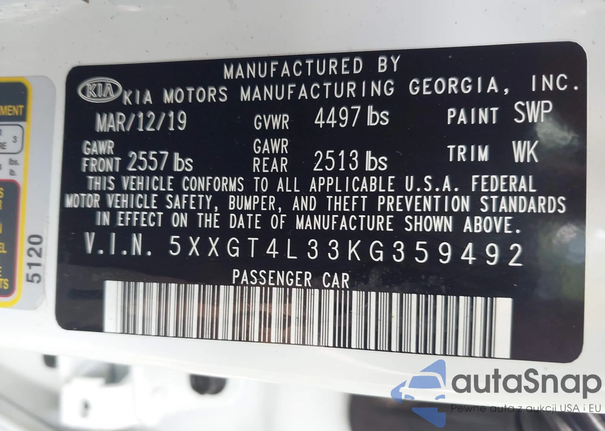 • VIN 5XXGT4L33KG359492