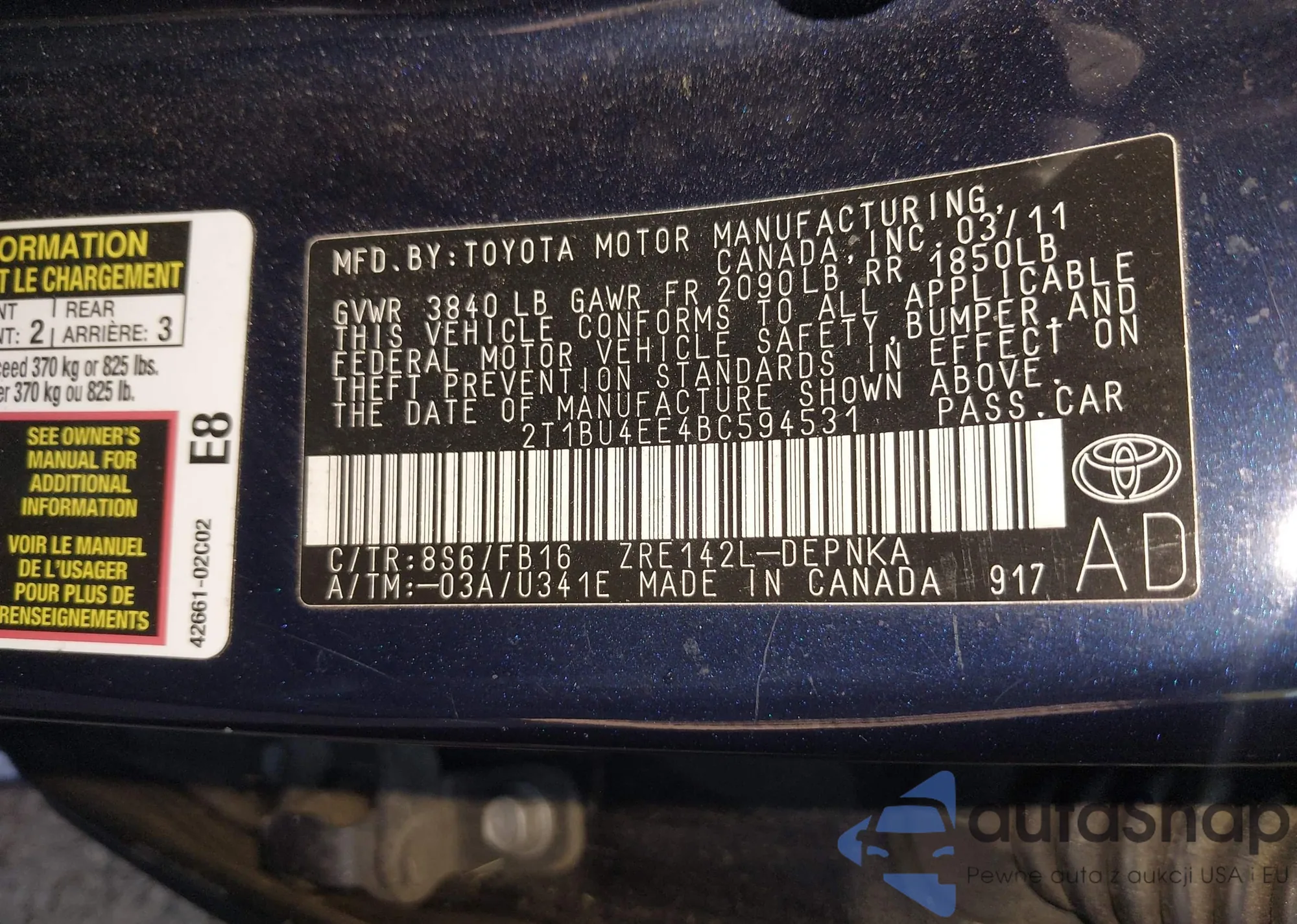 • VIN 2T1BU4EE4BC594531