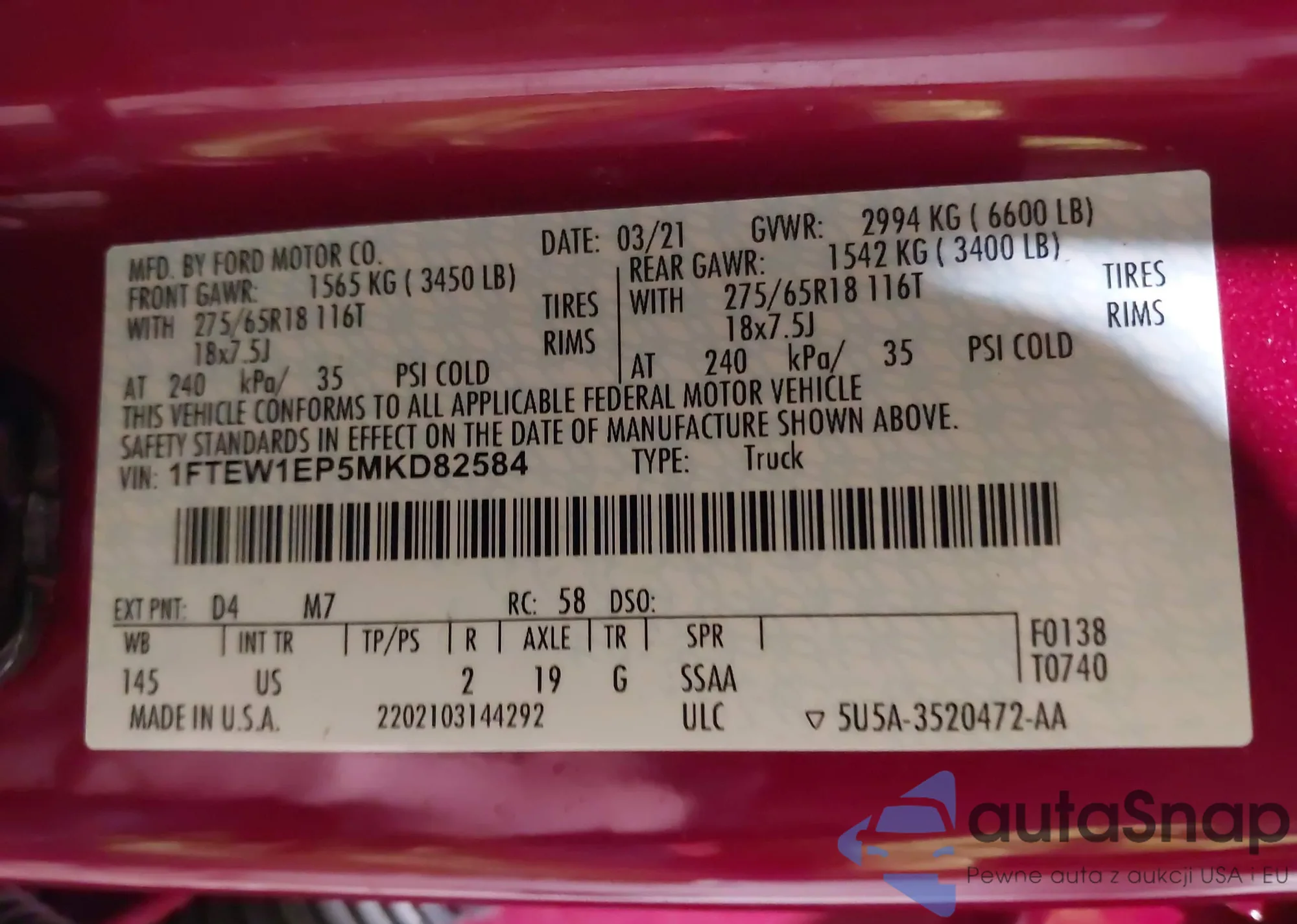 LOT: 42030348 VIN: 1FTEW1EP5MKD82584