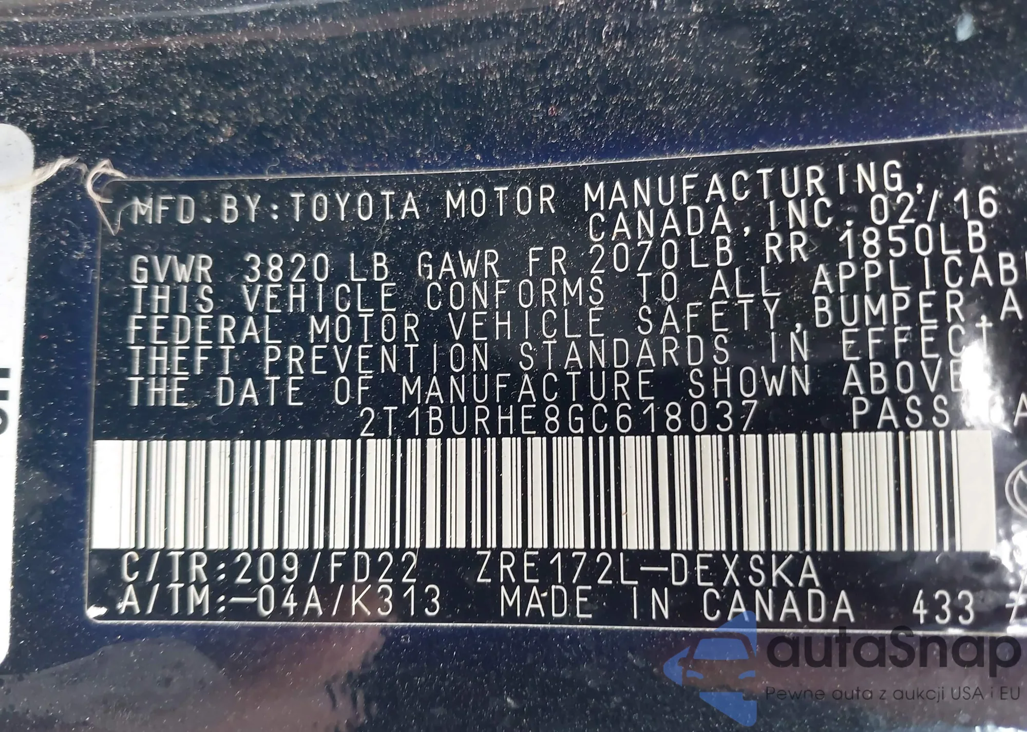 LOT: 42937080 VIN: 2T1BURHE8GC618037