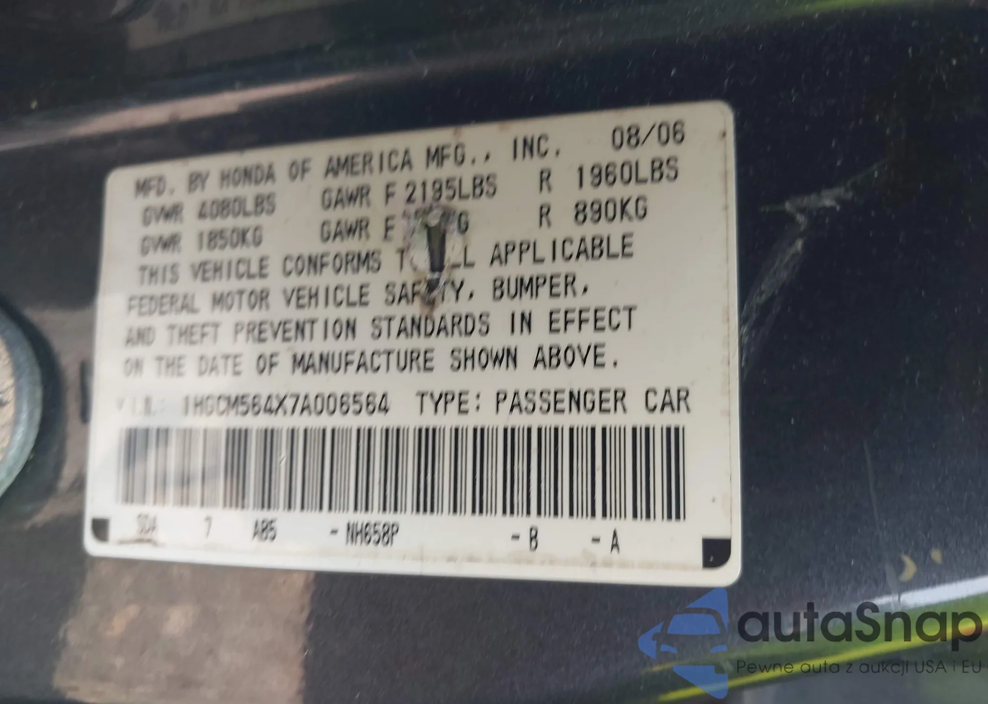 LOT: 42967458 VIN: 1HGCP26318A052444