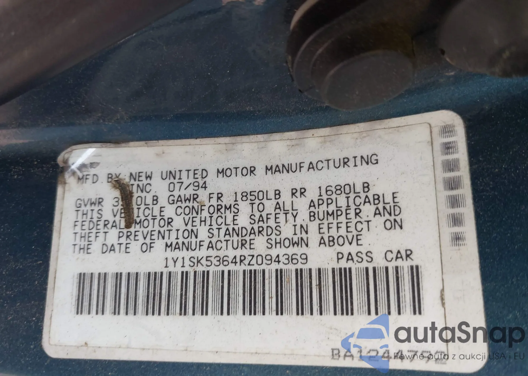 1994 Geo Prizm Lsi из США, поврежденный, VIN 1Y1SK5364RZ094369