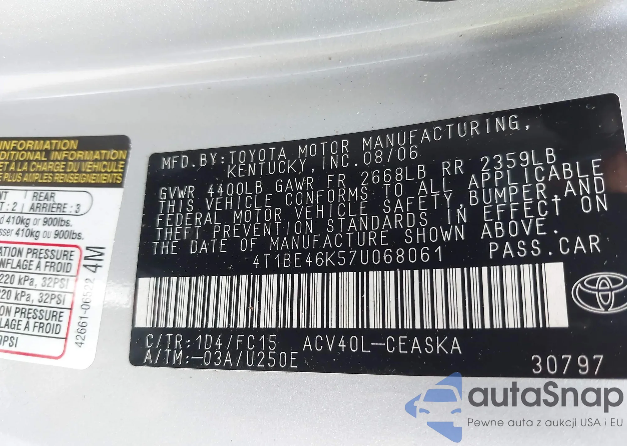 LOT: 42872377 VIN: 4T1BE46K57U068061
