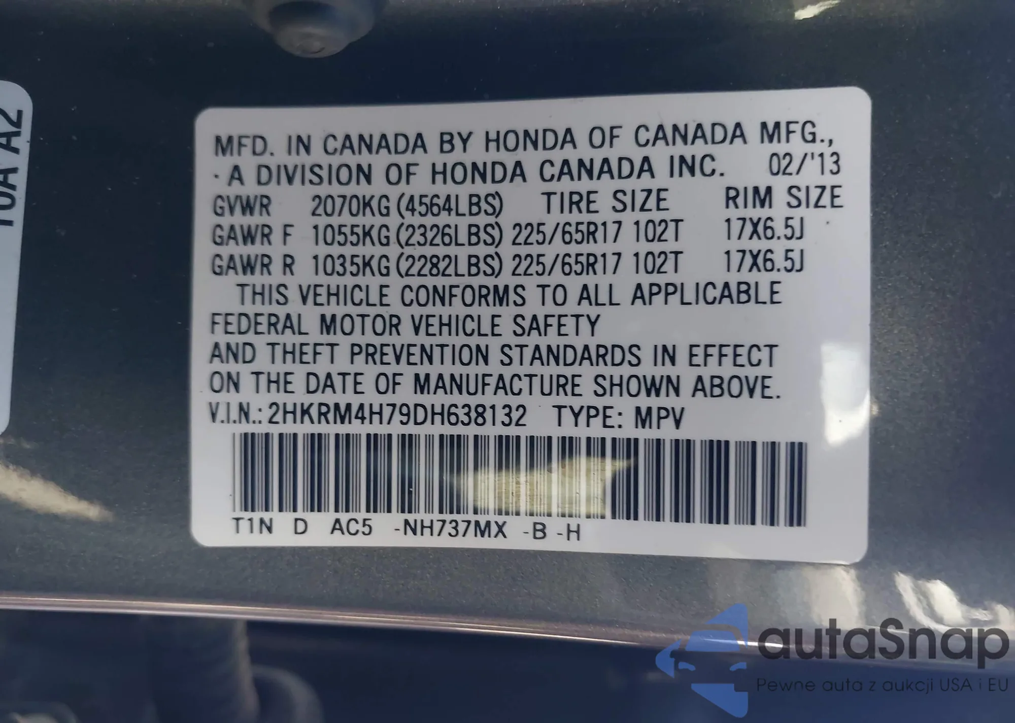 • VIN 2HKRM4H79DH638132