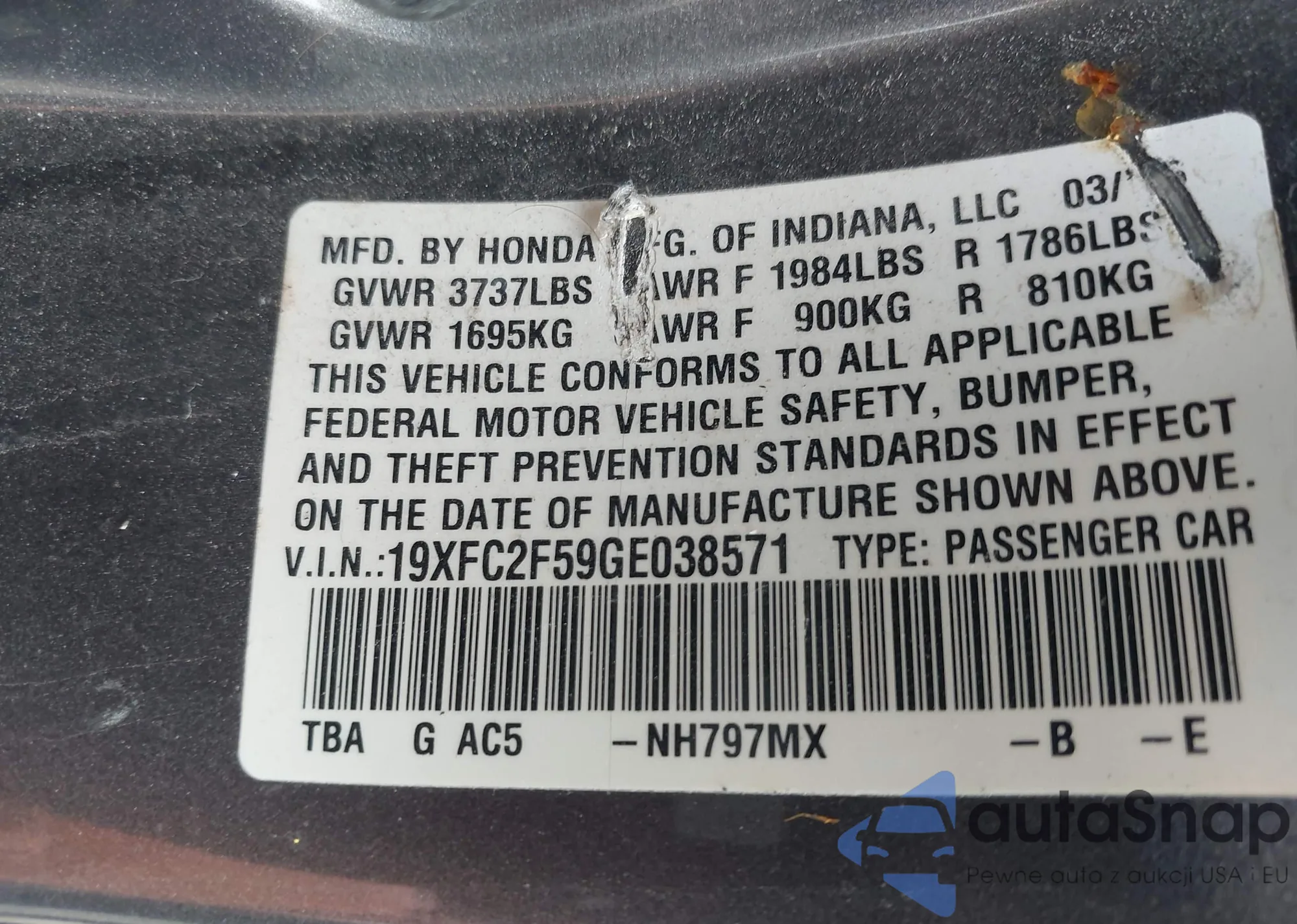 LOT: 42658293 VIN: 19XFC2F59GE038571