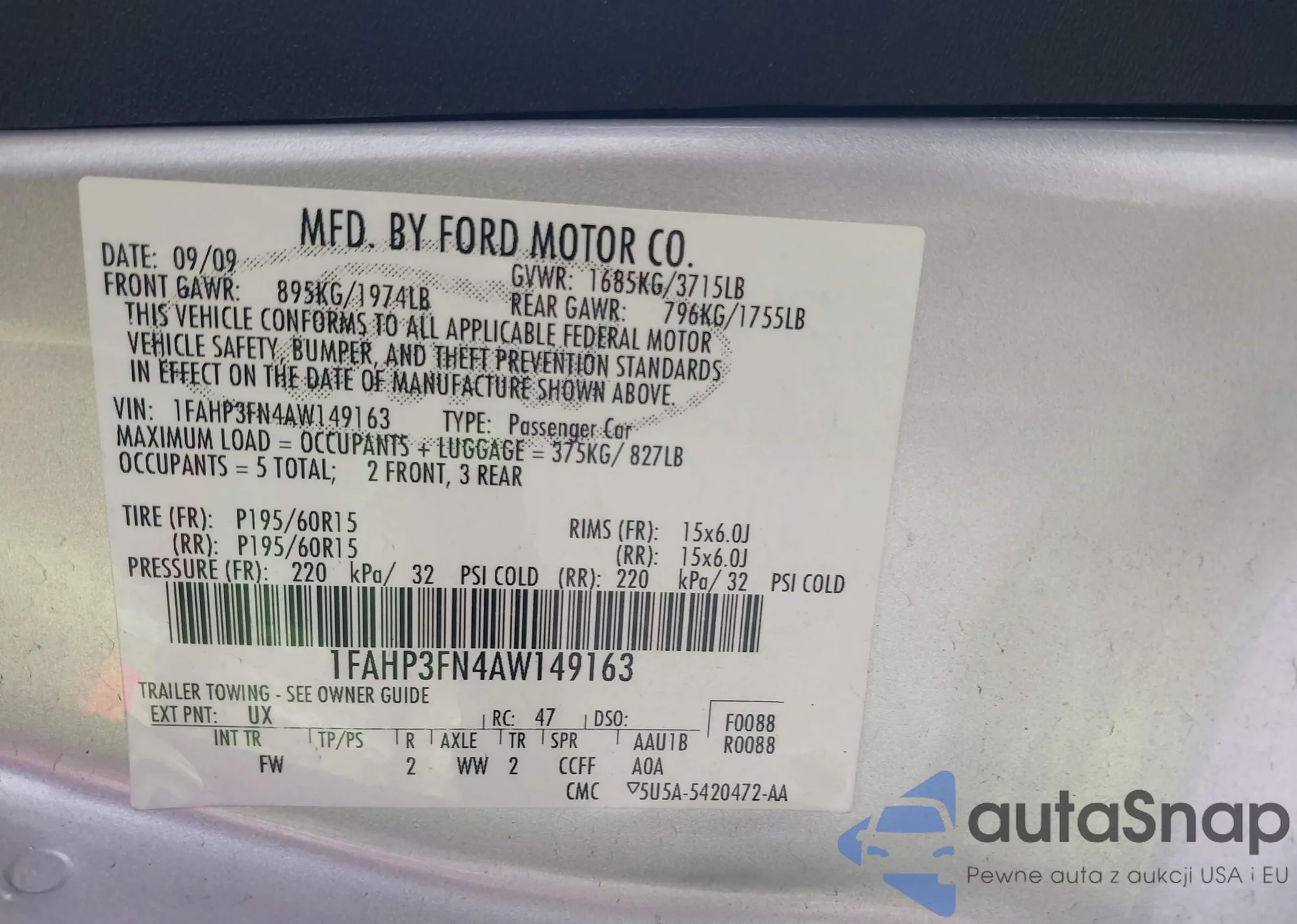 LOT: 42907486 VIN: 1FAHP3FN4AW149163