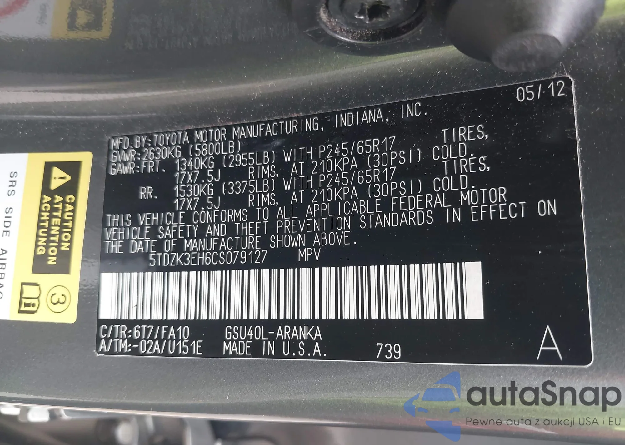 LOT: 42901059 VIN: 5TDZK3EH6CS079127