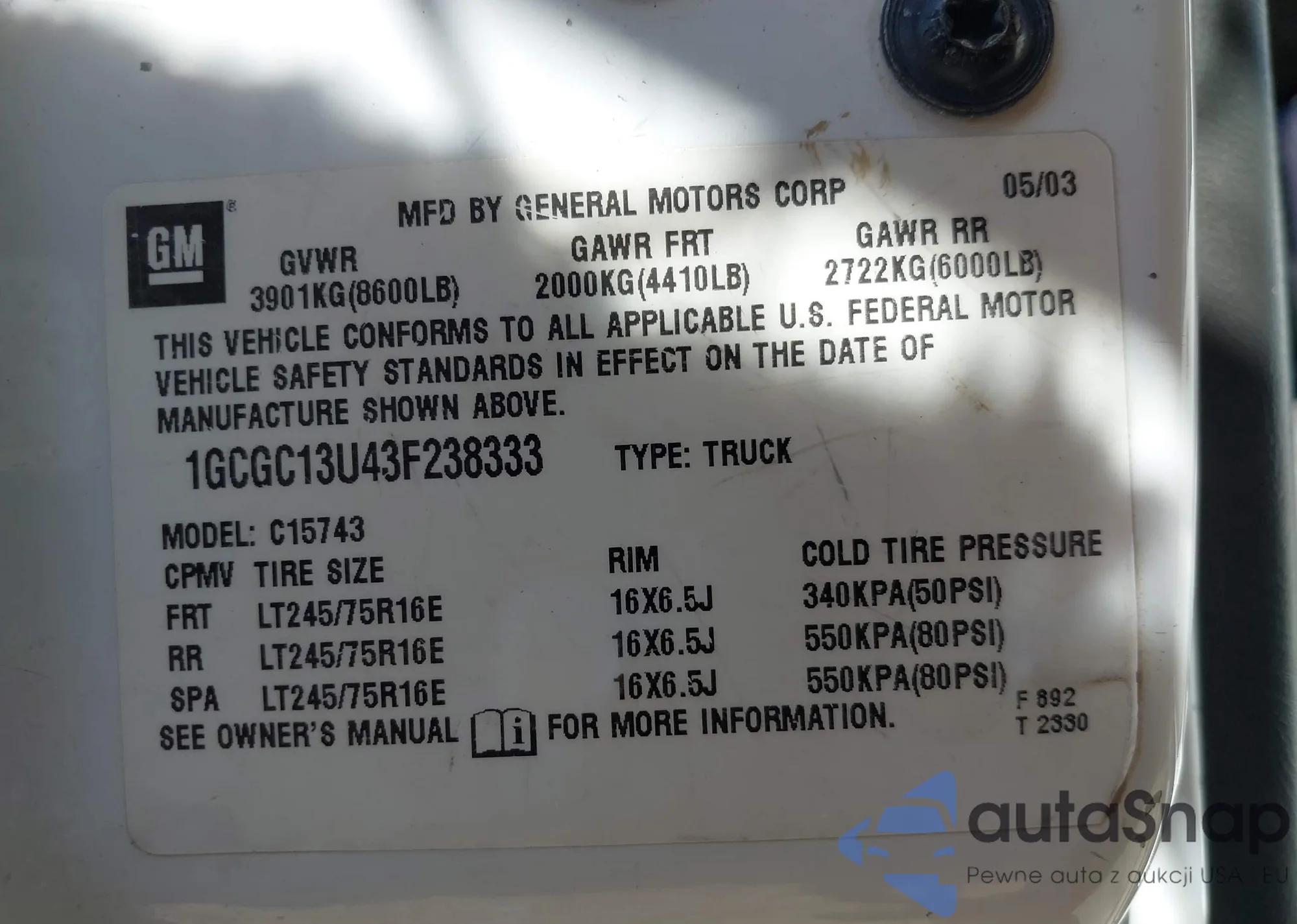 • VIN 1GCGC13U43F238333