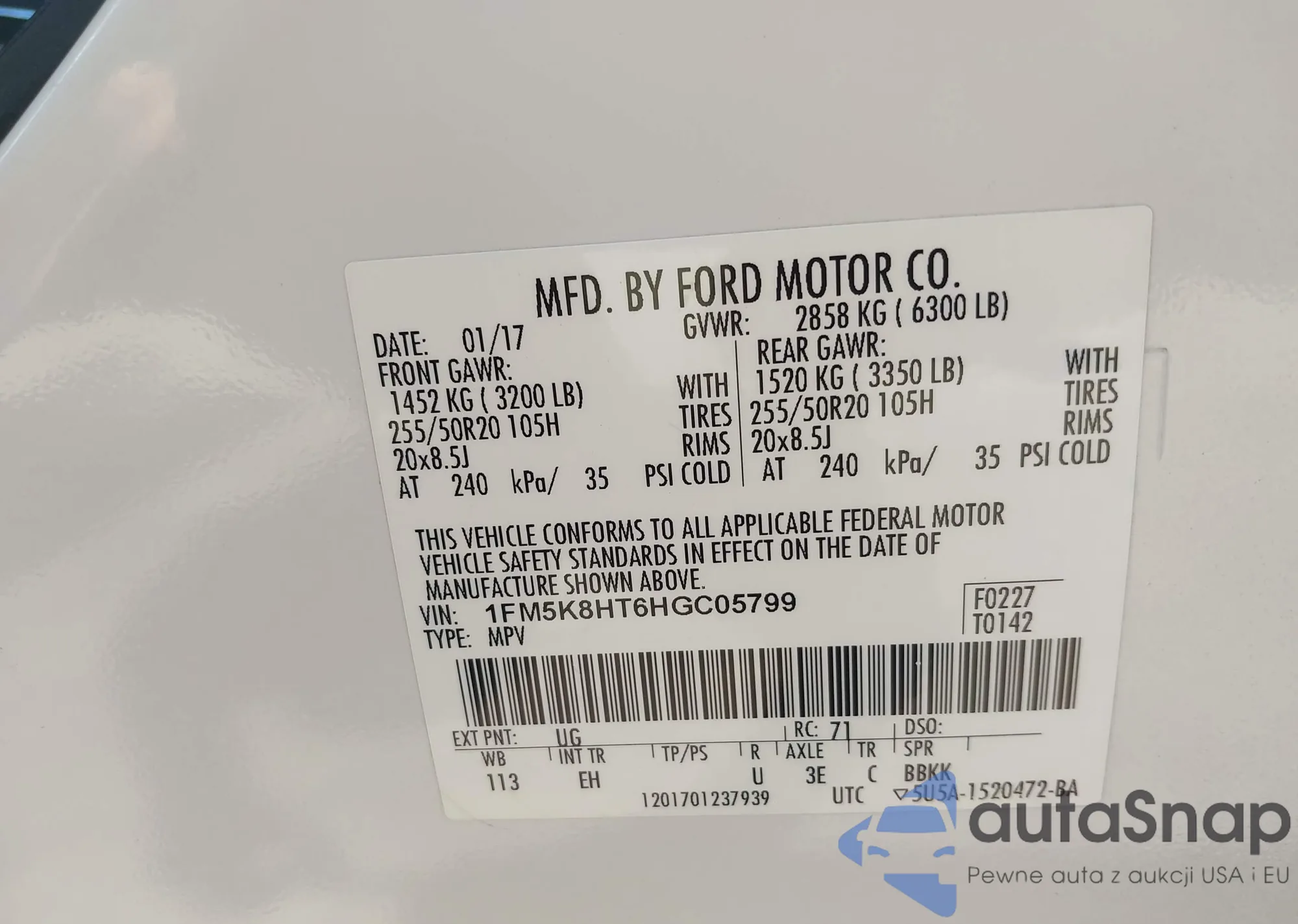 LOT: 42826680 VIN: 1FM5K8HT6HGC05799