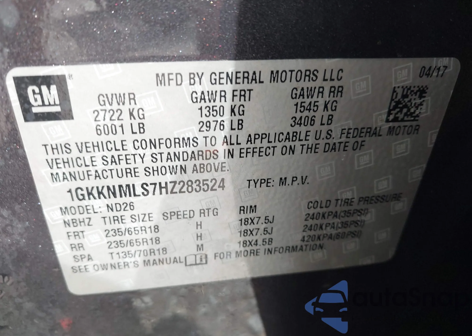 • VIN 1GKKNMLS7HZ283524